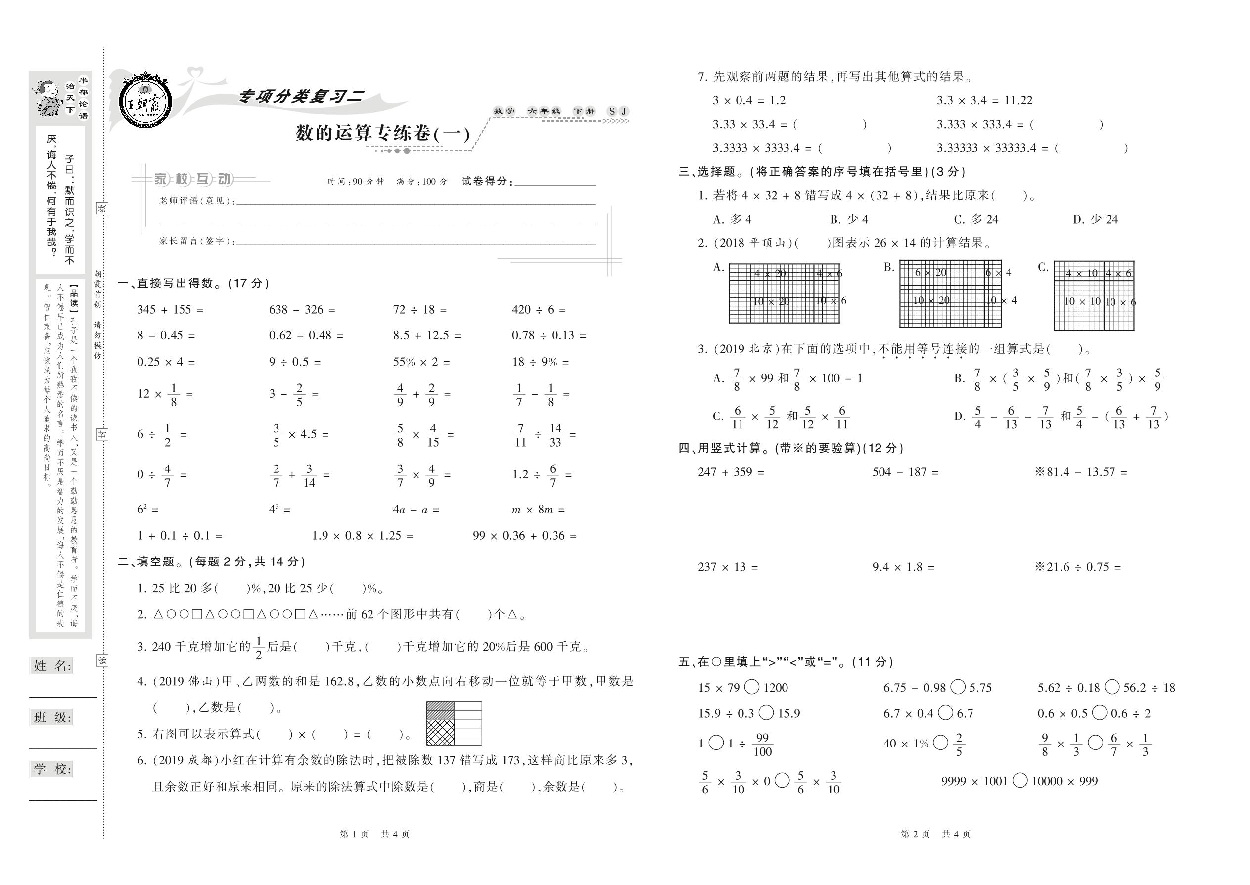 2021下册六年级数学苏教版 数的运算专练卷(一)