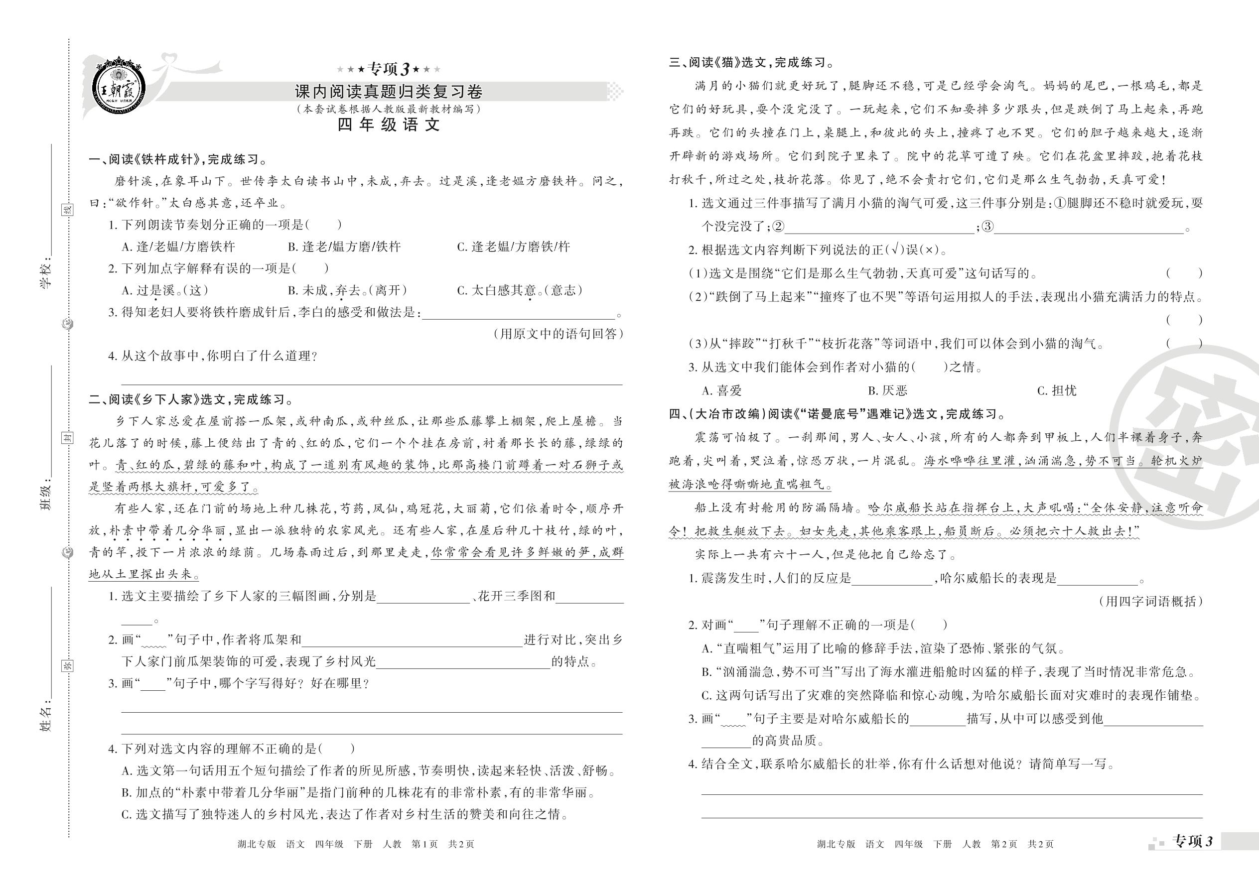 王朝霞期末专项卷——课内阅读、课外阅读真题归类复习四年级下册语文(人教版)_R210801183240【0】