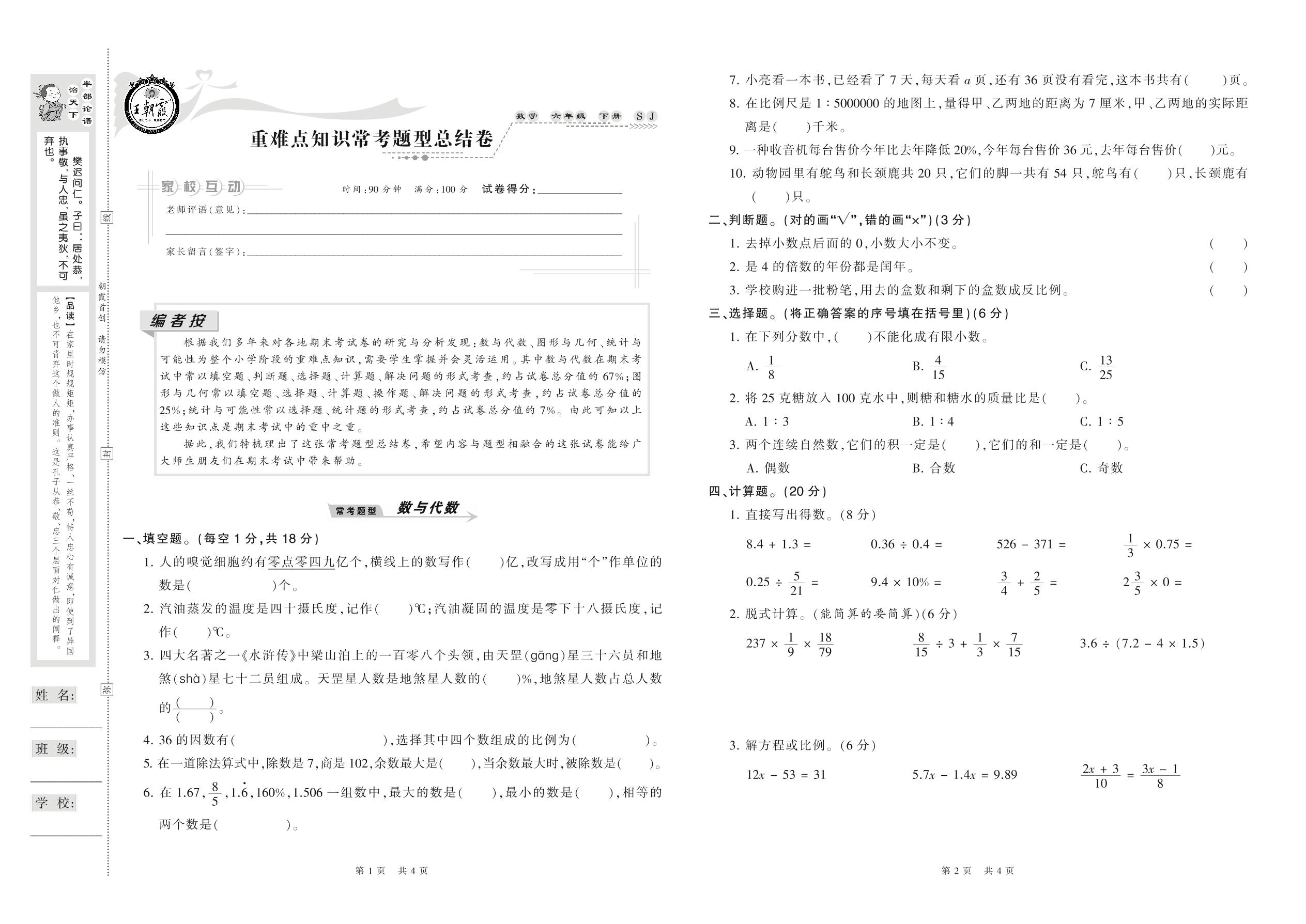 2021下册六年级数学苏教版 重难点知识常考题型总结卷