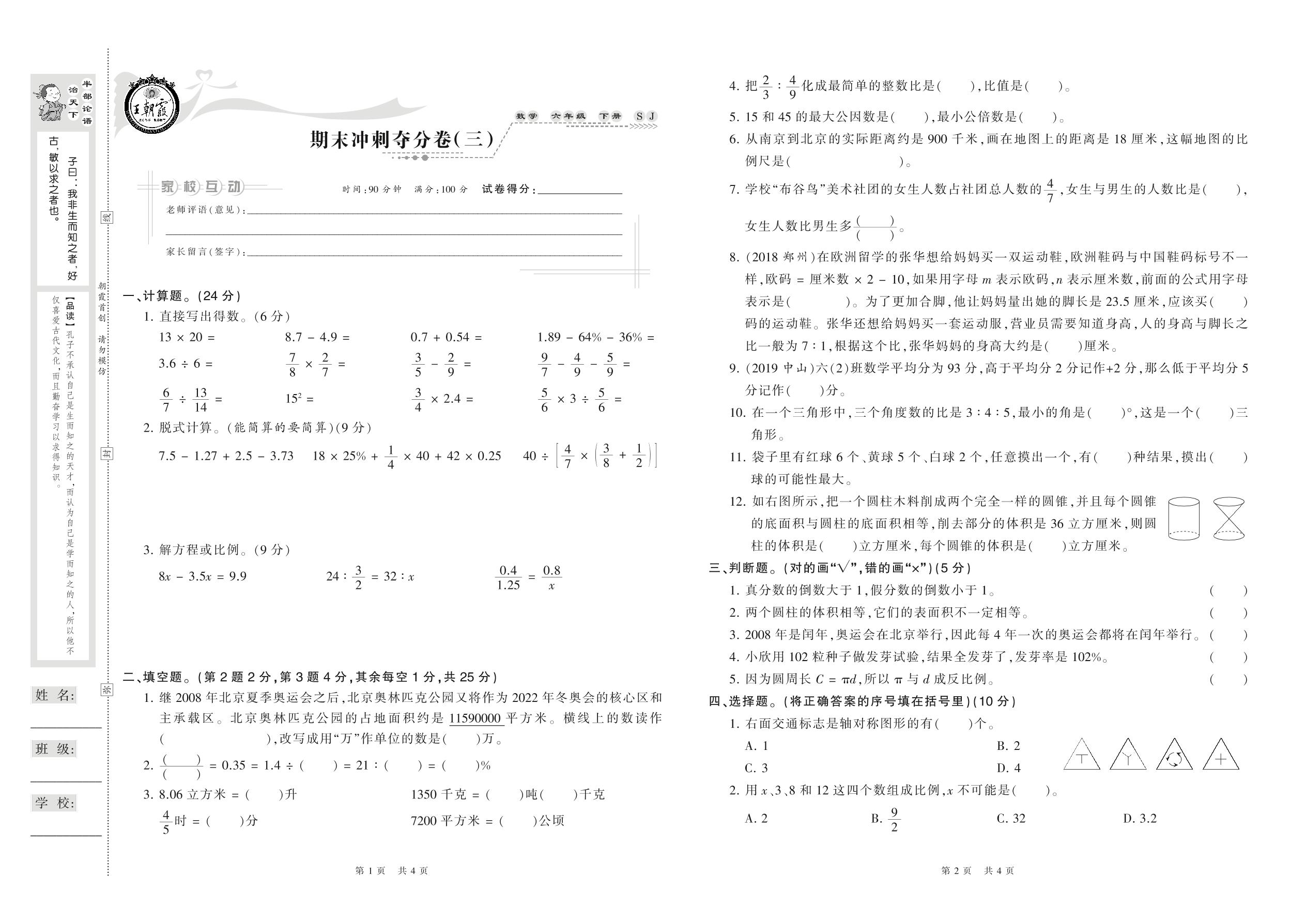 2021下册六年级数学苏教版 期末冲刺夺分卷(三)