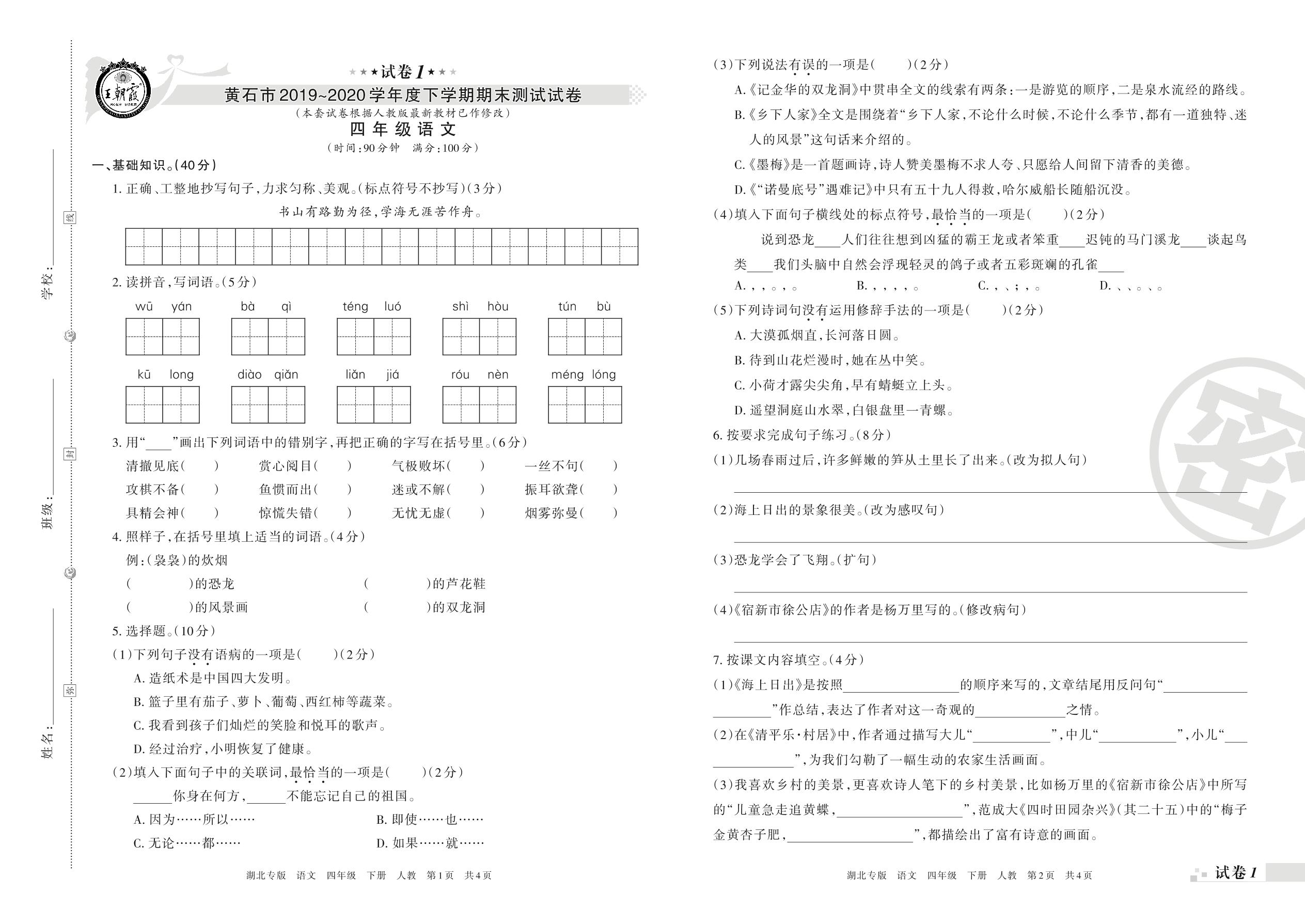 2019-2020学年第二学期黄石市四年级语文试卷(人教版)【1】