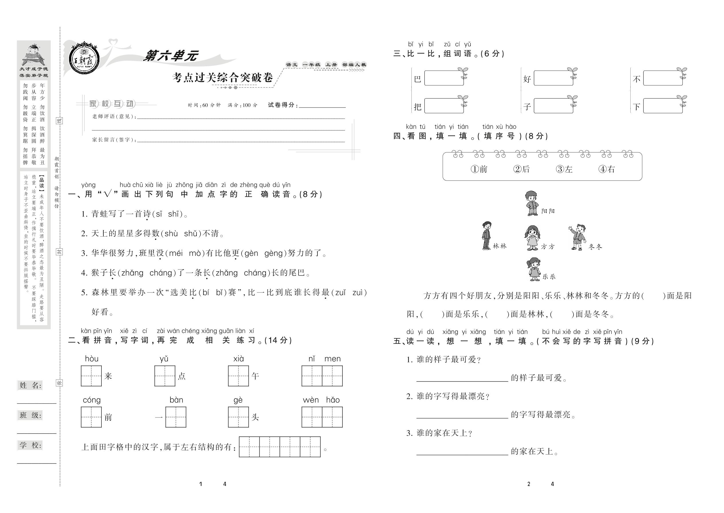 2020上册一年级语文人教版 第六单元 考点过关综合突破卷