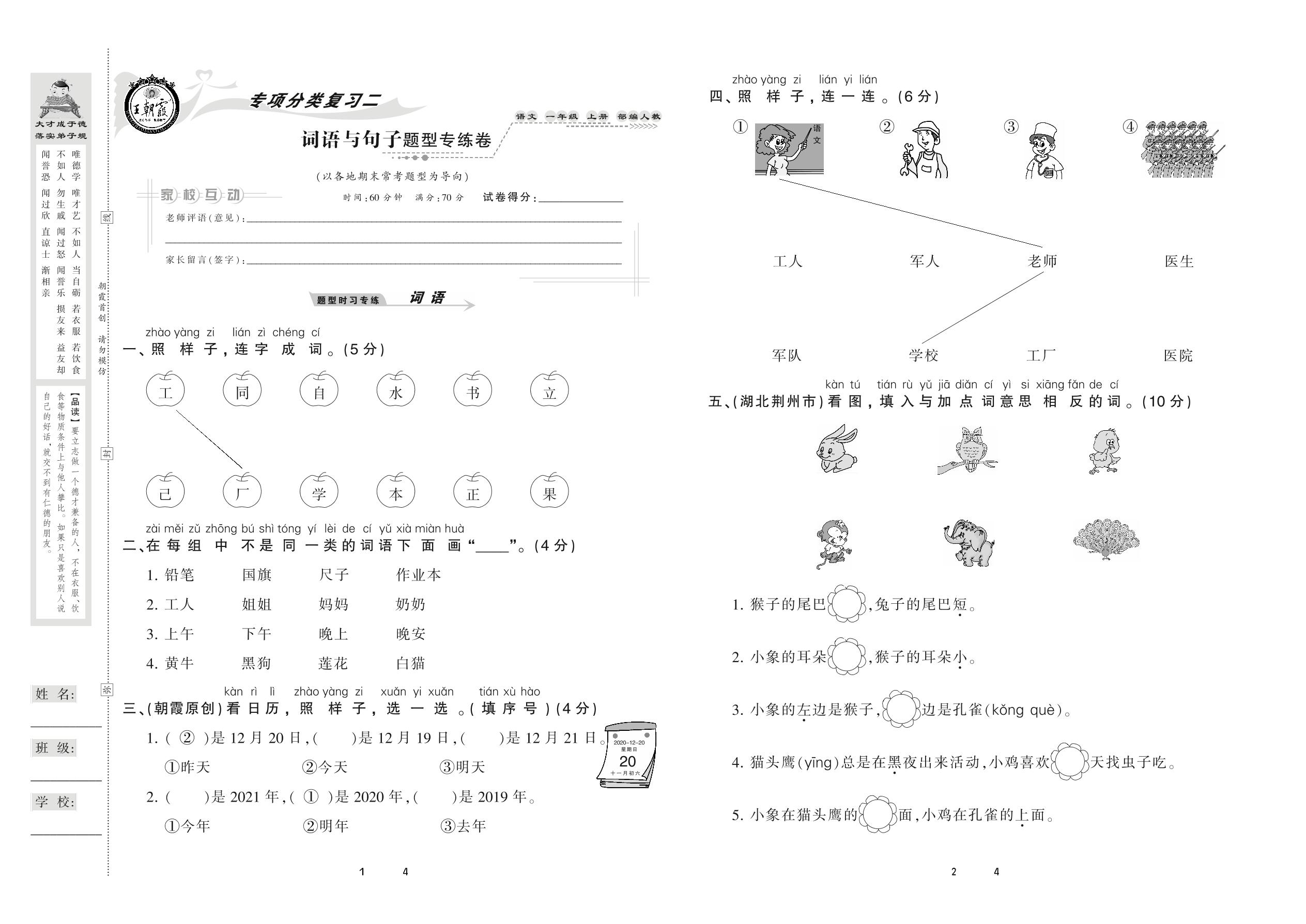 2020上册一年级语文人教版 词语与句子题型专练卷