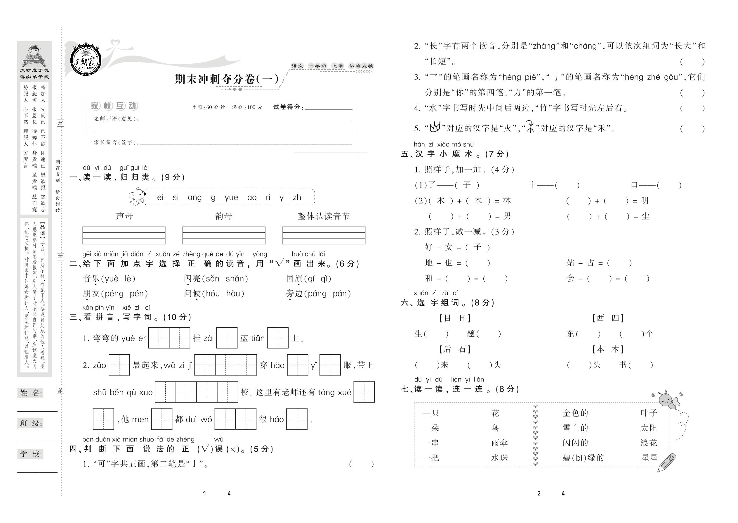 2020上册一年级语文人教版 期末冲刺夺分卷(一)
