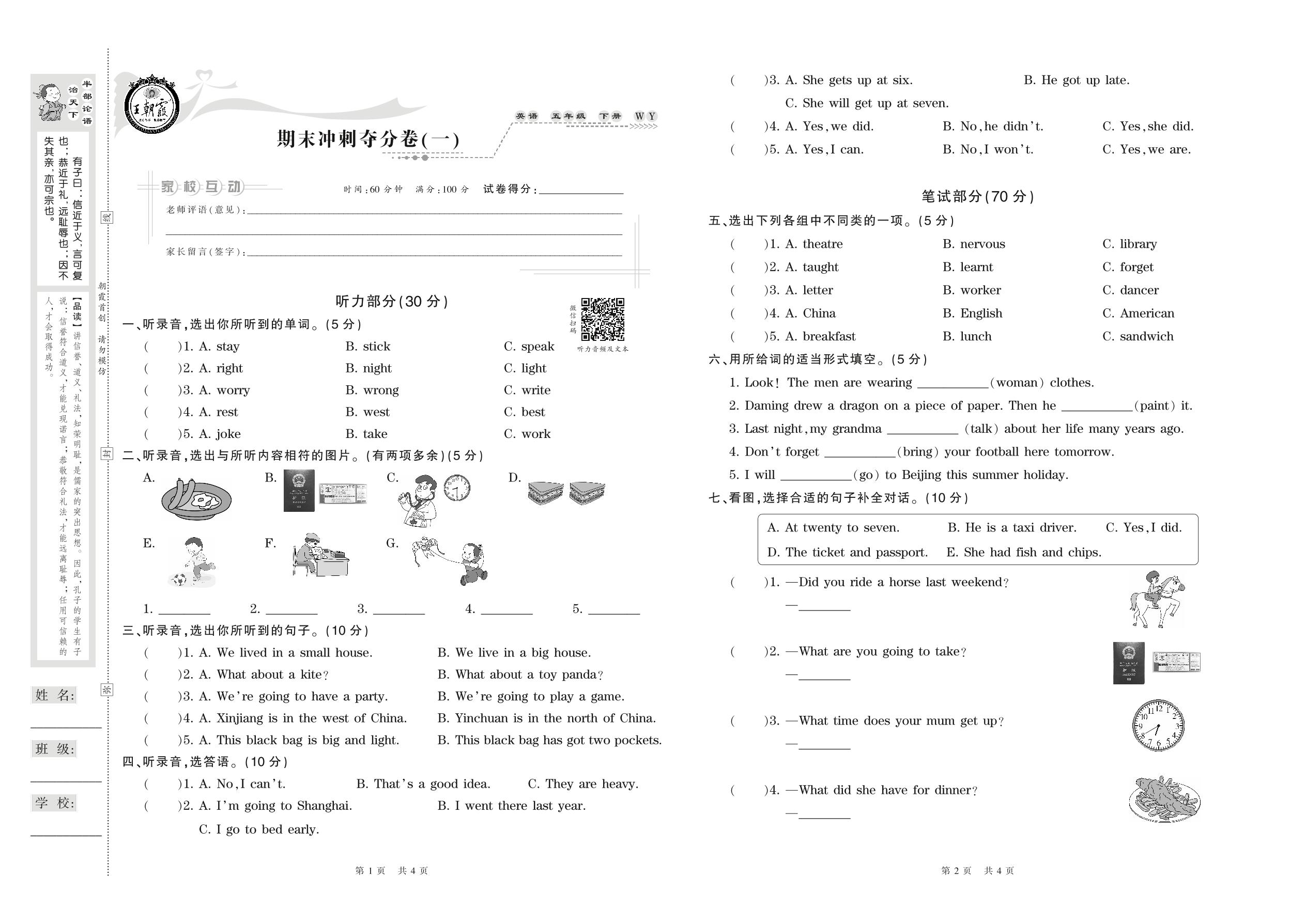 五年级英语外研版(三起始)下册期末卷