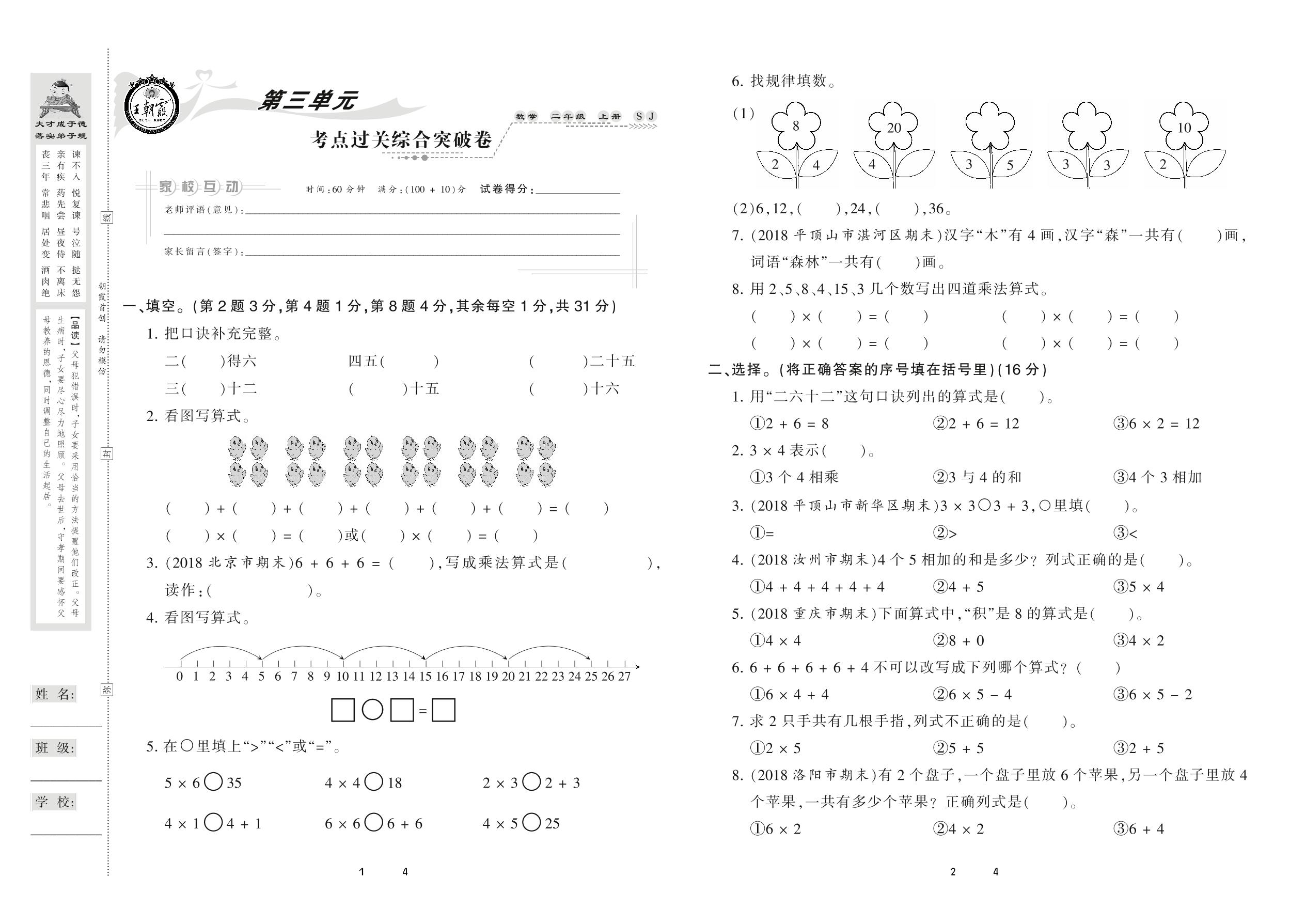 2020上册二年级数学苏教版 第三单元 考点过关综合突破卷