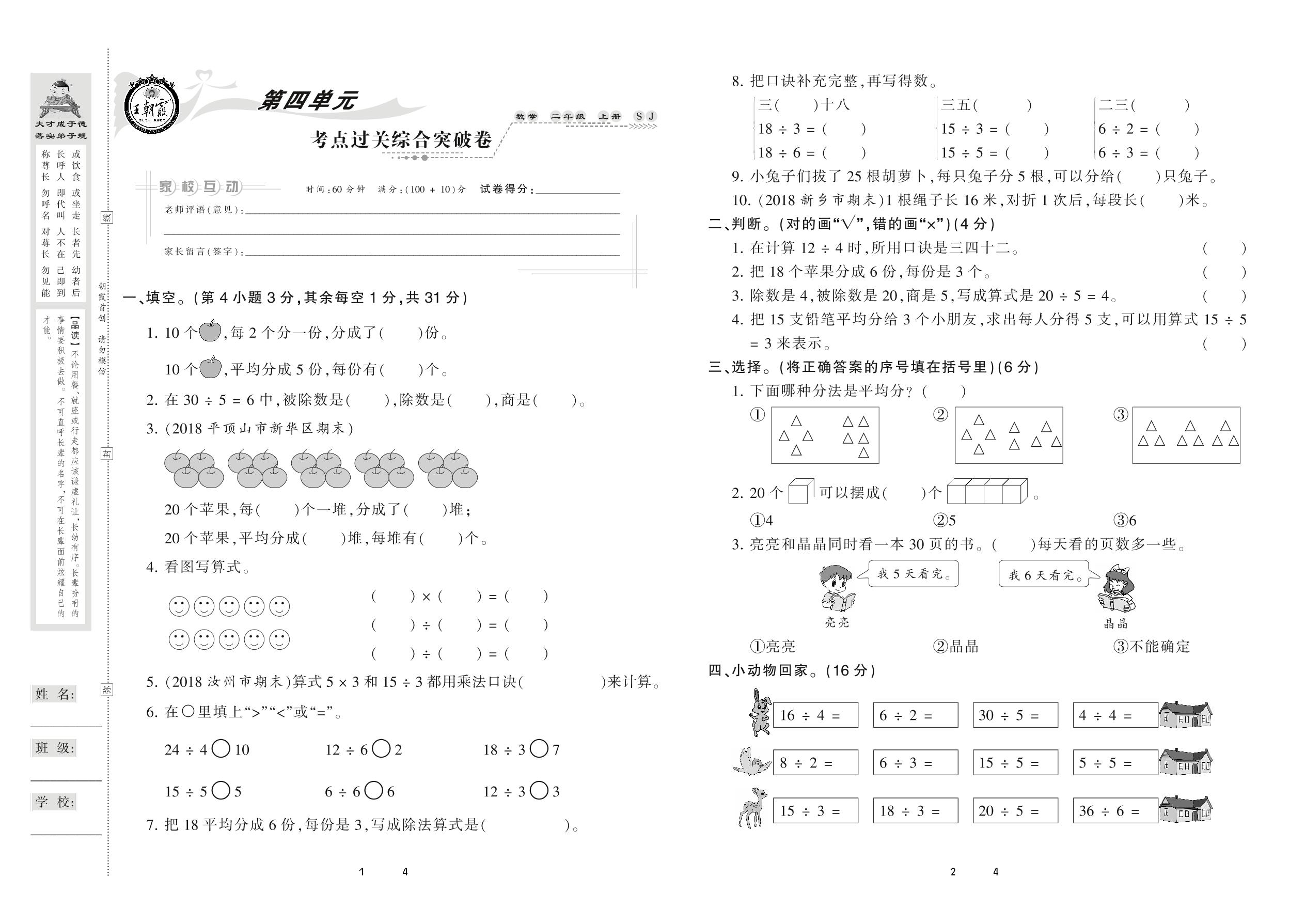 2020上册二年级数学苏教版 第四单元 考点过关综合突破卷
