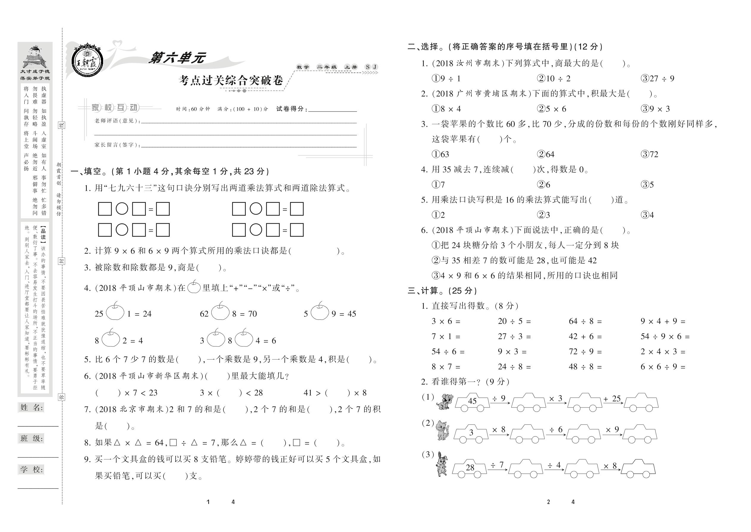 2020上册二年级数学苏教版 第六单元 考点过关综合突破卷
