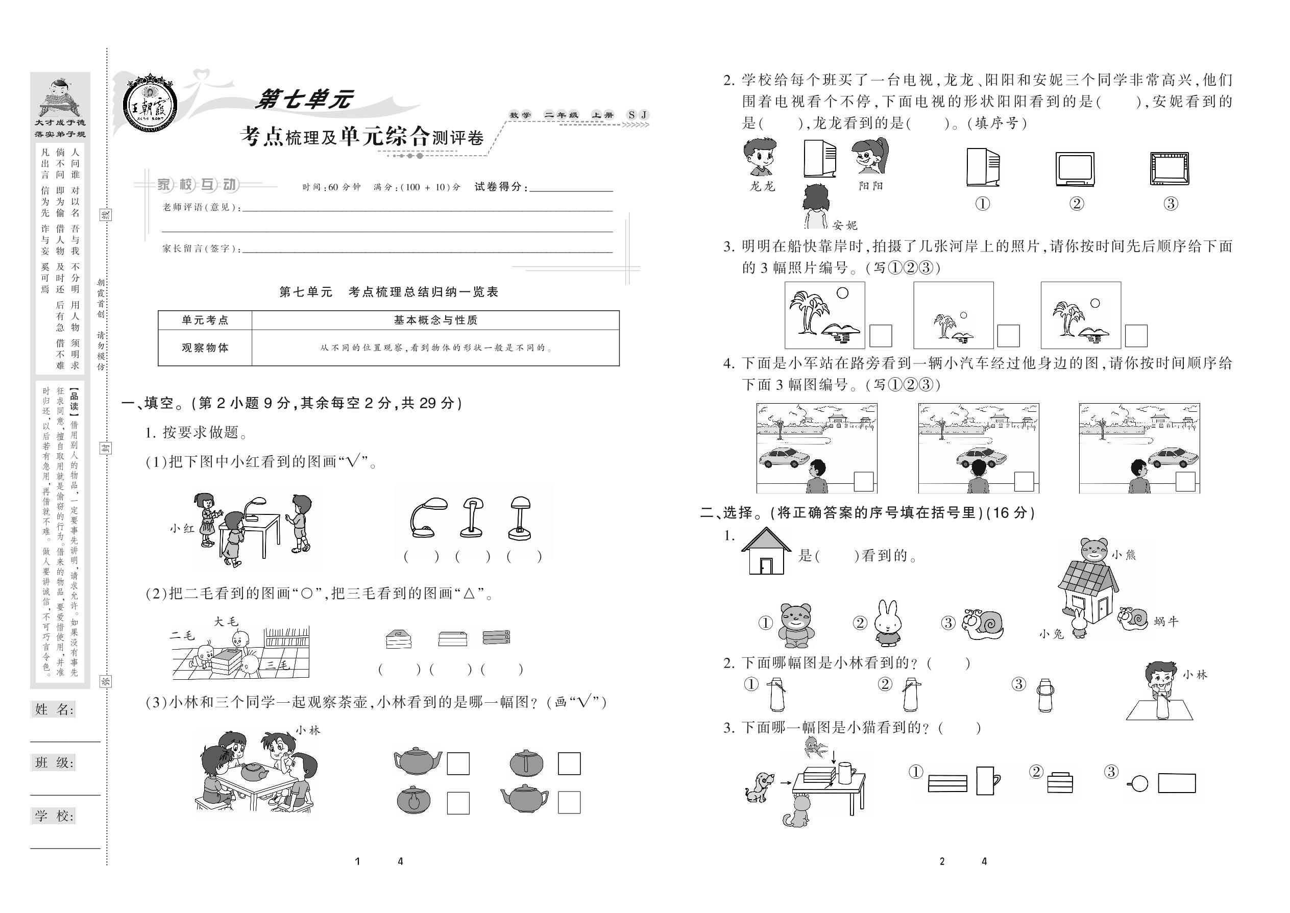 2020上册二年级数学苏教版 第七单元 考点梳理及单元综合测评卷