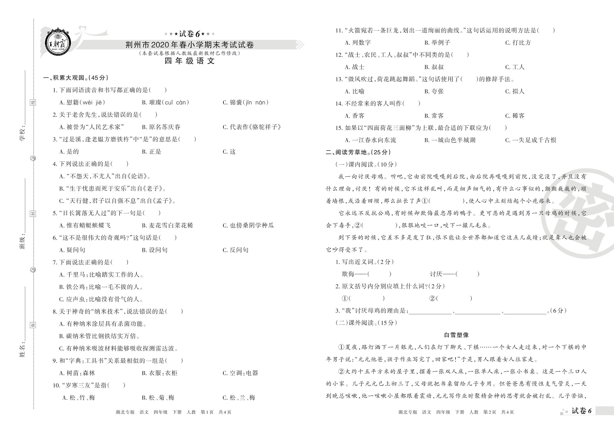 2019-2020学年第二学期荆州市四年级语文试卷(人教版)【6】