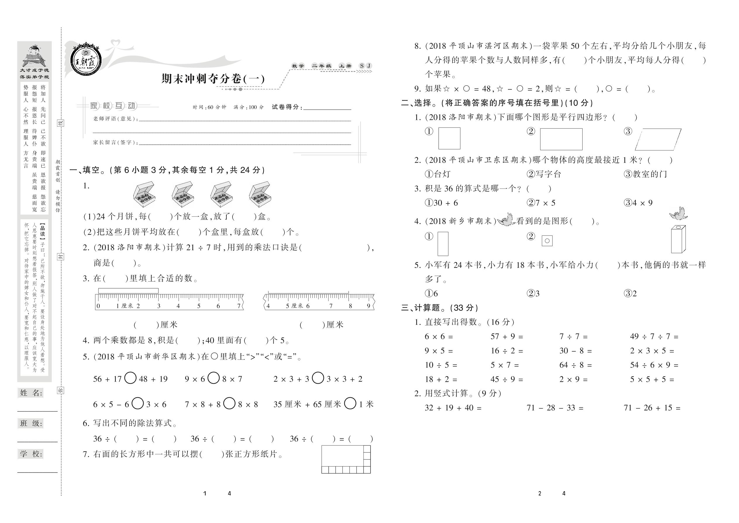 2020上册二年级数学苏教版 期末冲刺夺分卷(一)