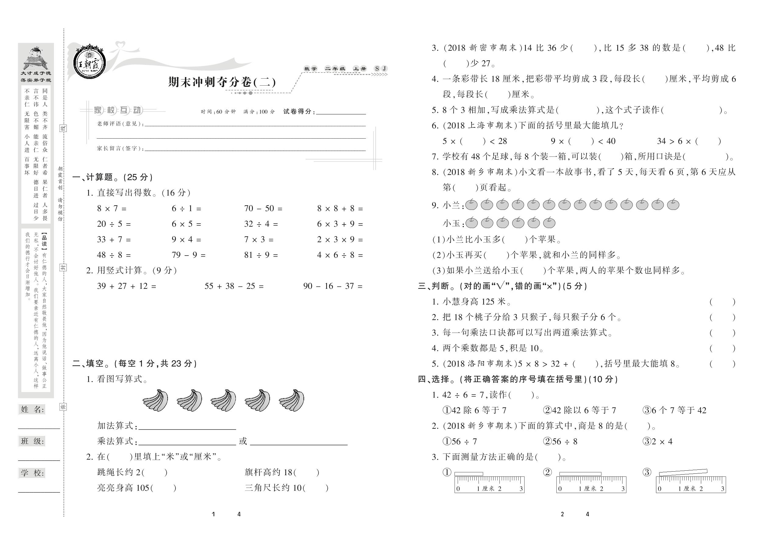 2020上册二年级数学苏教版 期末冲刺夺分卷(二)