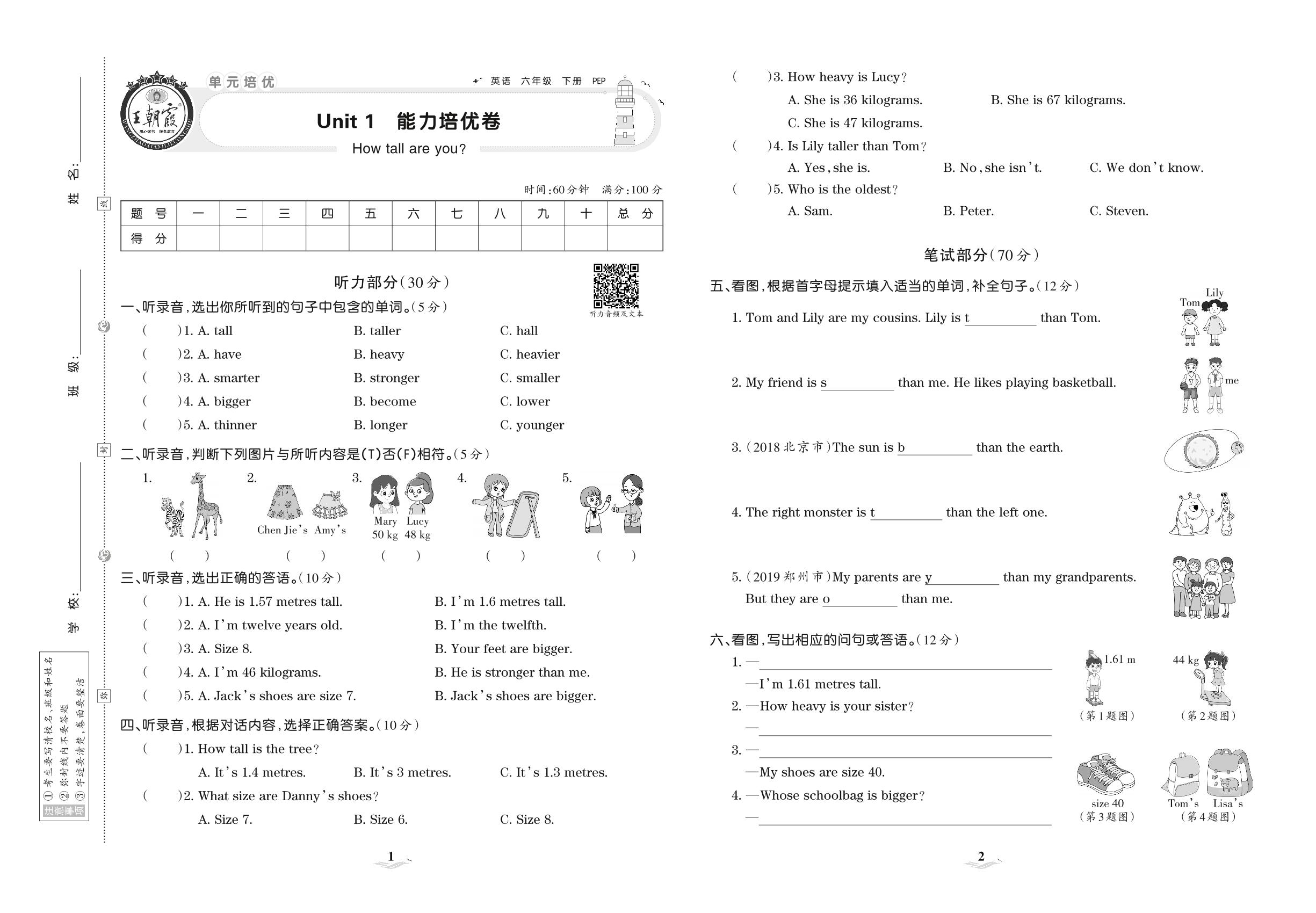 2021下册六年级英语PEP版 Unit 1 能力培优卷