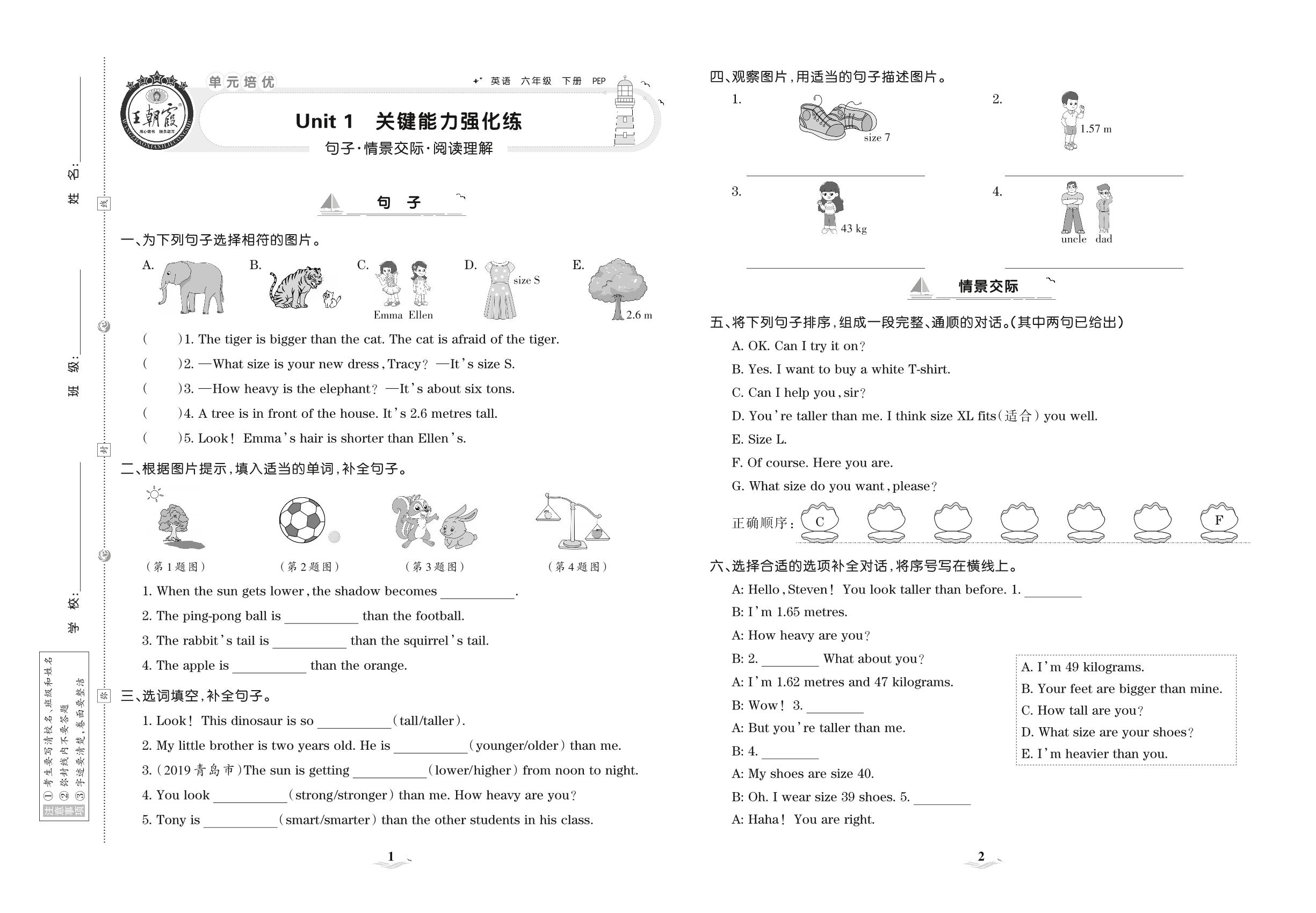 2021下册六年级英语PEP版 Unit 1 关键能力强化练