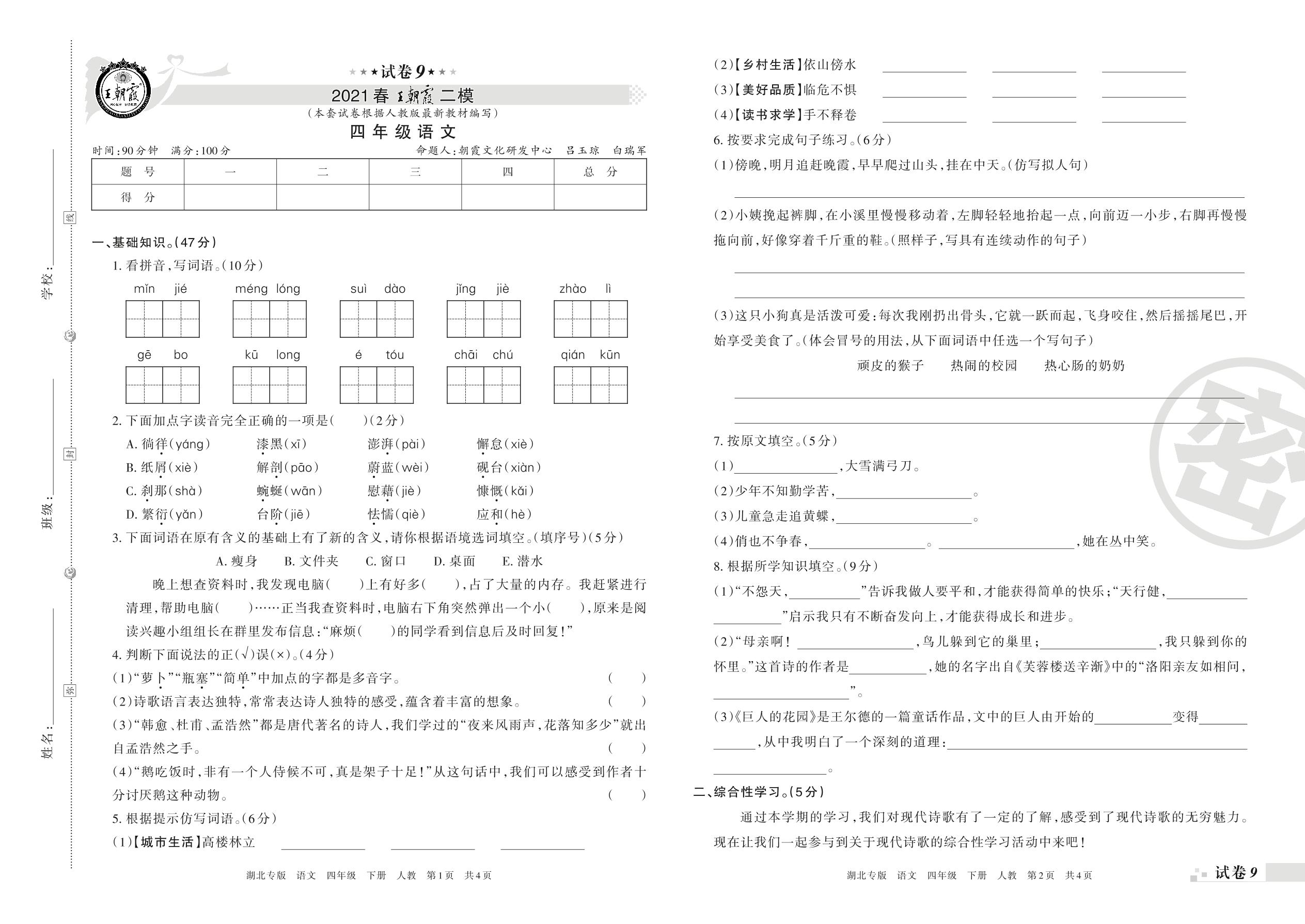 王朝霞期末模拟卷四年级下册语文(人教版)_R210801183323【9】