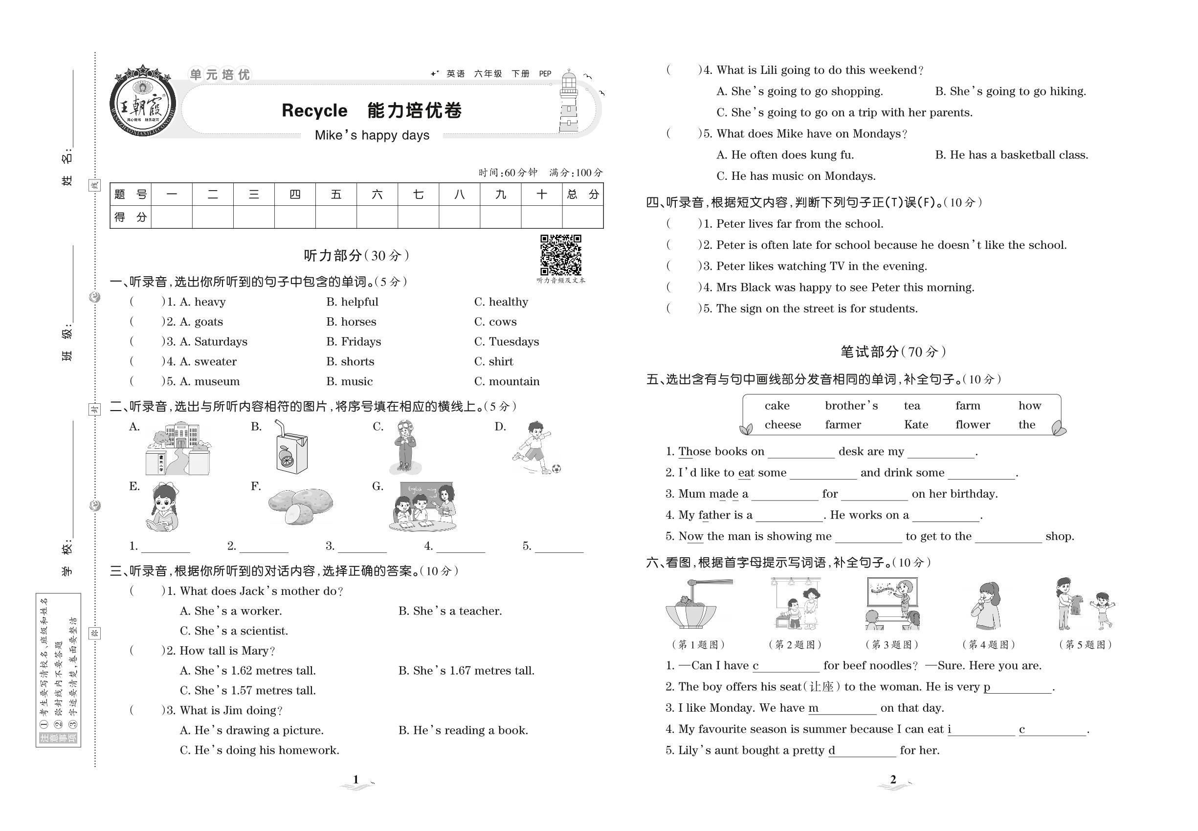 2021下册六年级英语PEP版 Recycle 能力培优卷