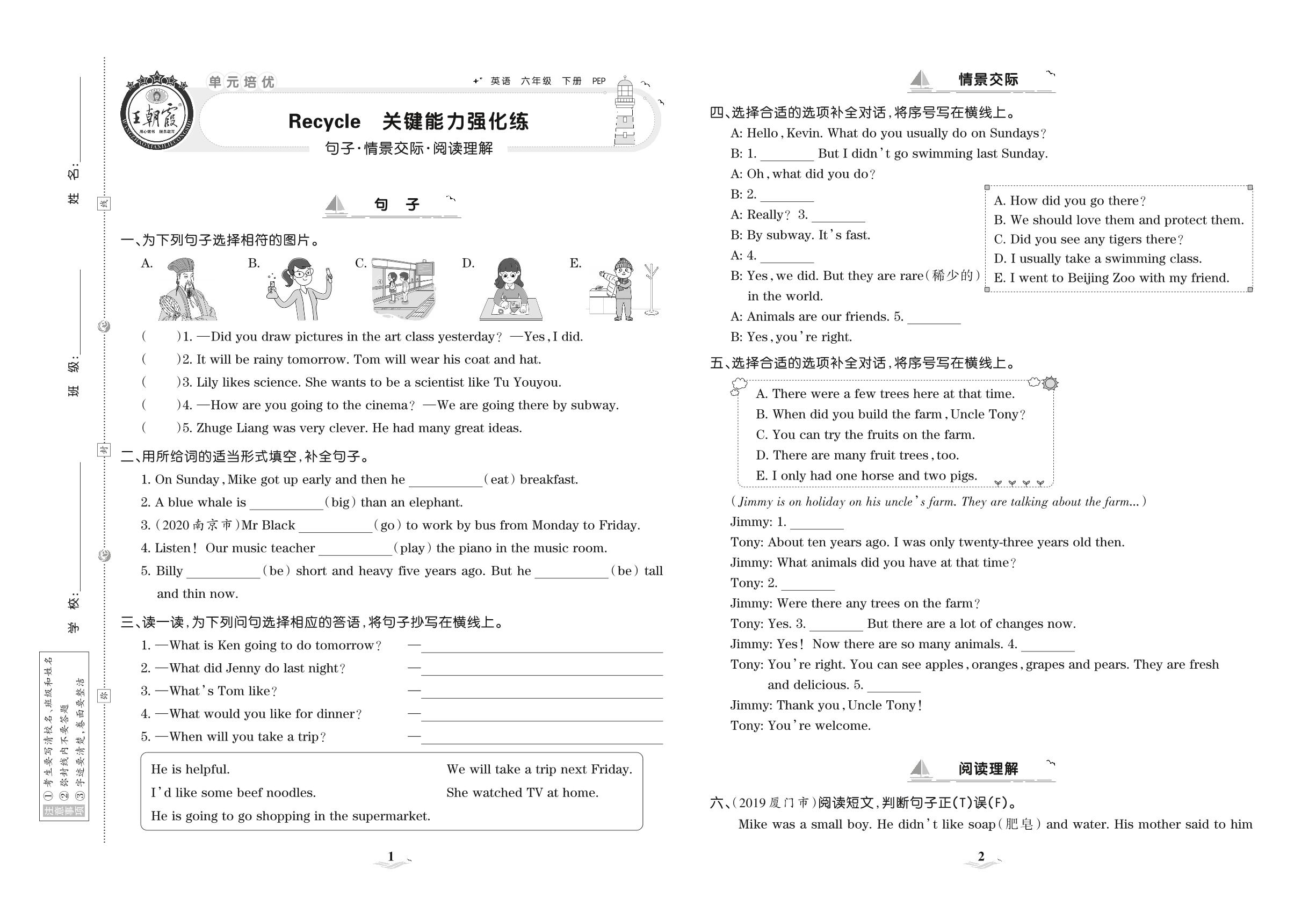 2021下册六年级英语PEP版 Recycle 关键能力强化练