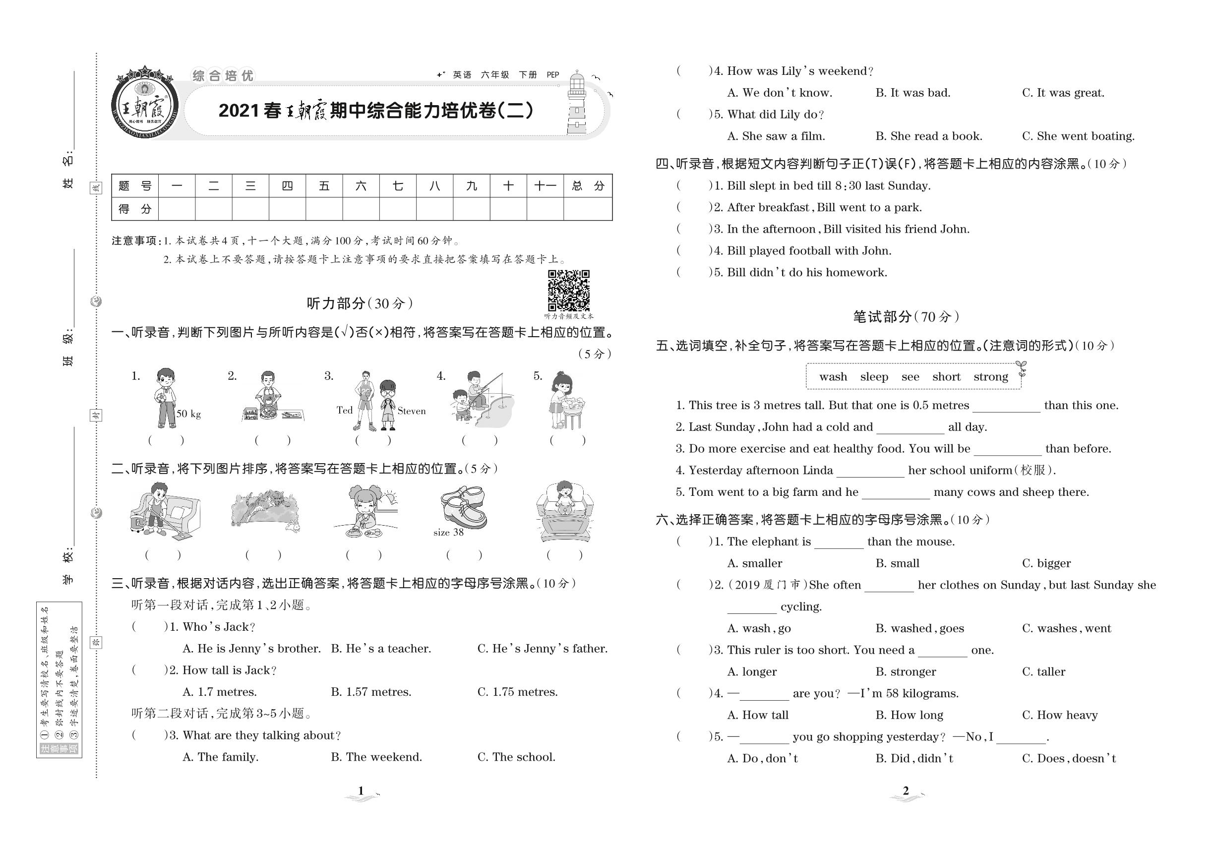 2021下册六年级英语PEP版 王朝霞期中综合能力培优卷(二)
