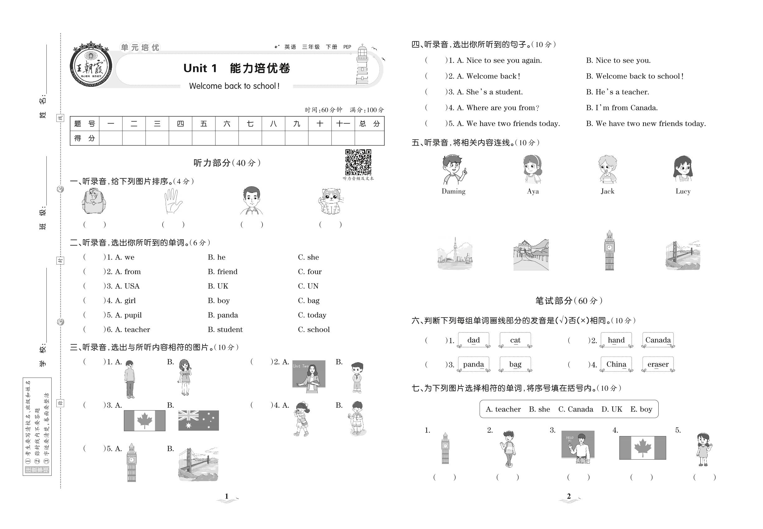 2021下册三年级英语PEP版 Unit 1 能力培优卷