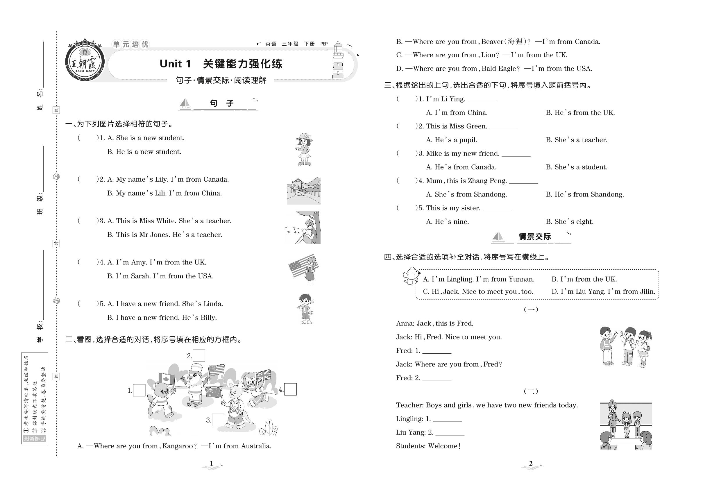 2021下册三年级英语PEP版 Unit 1 关键能力强化练