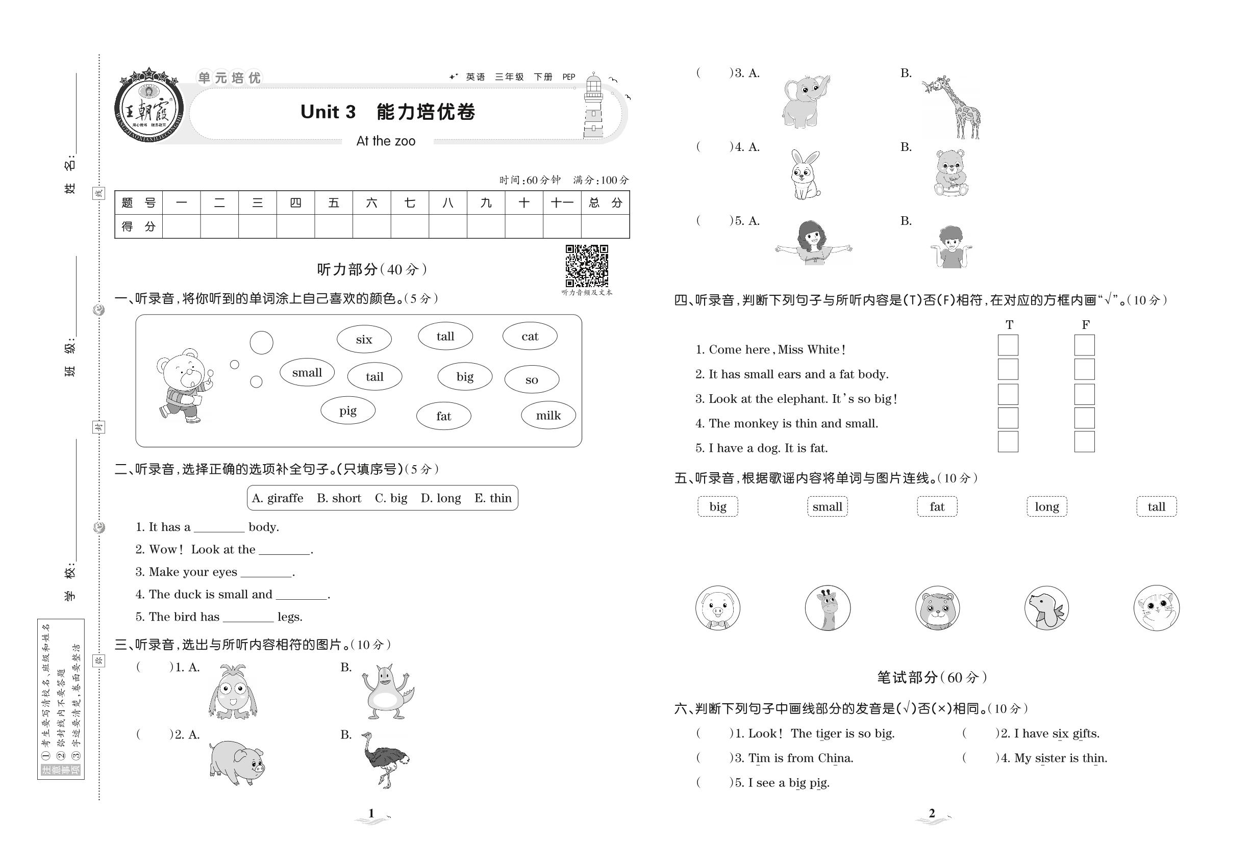 2021下册三年级英语PEP版 Unit 3 能力培优卷