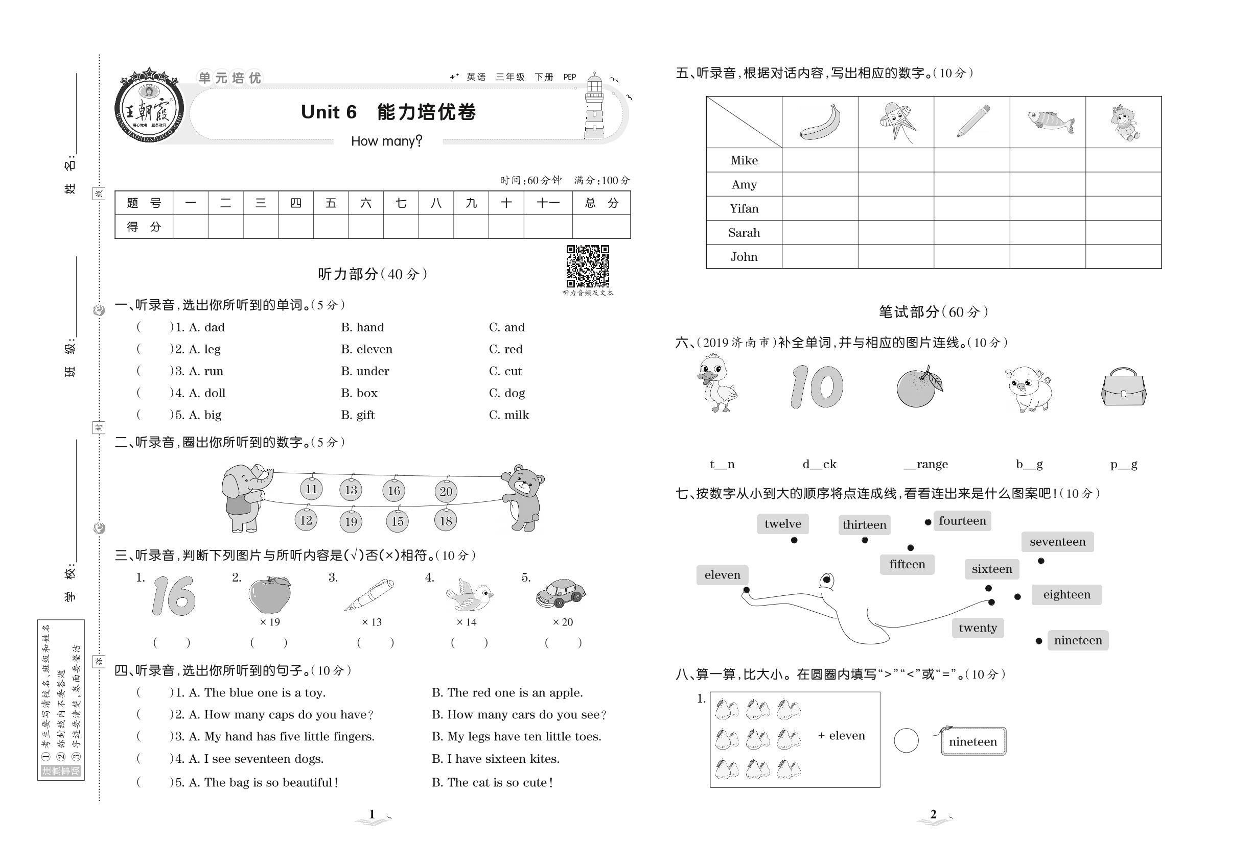 2021下册三年级英语PEP版 Unit 6 能力培优卷
