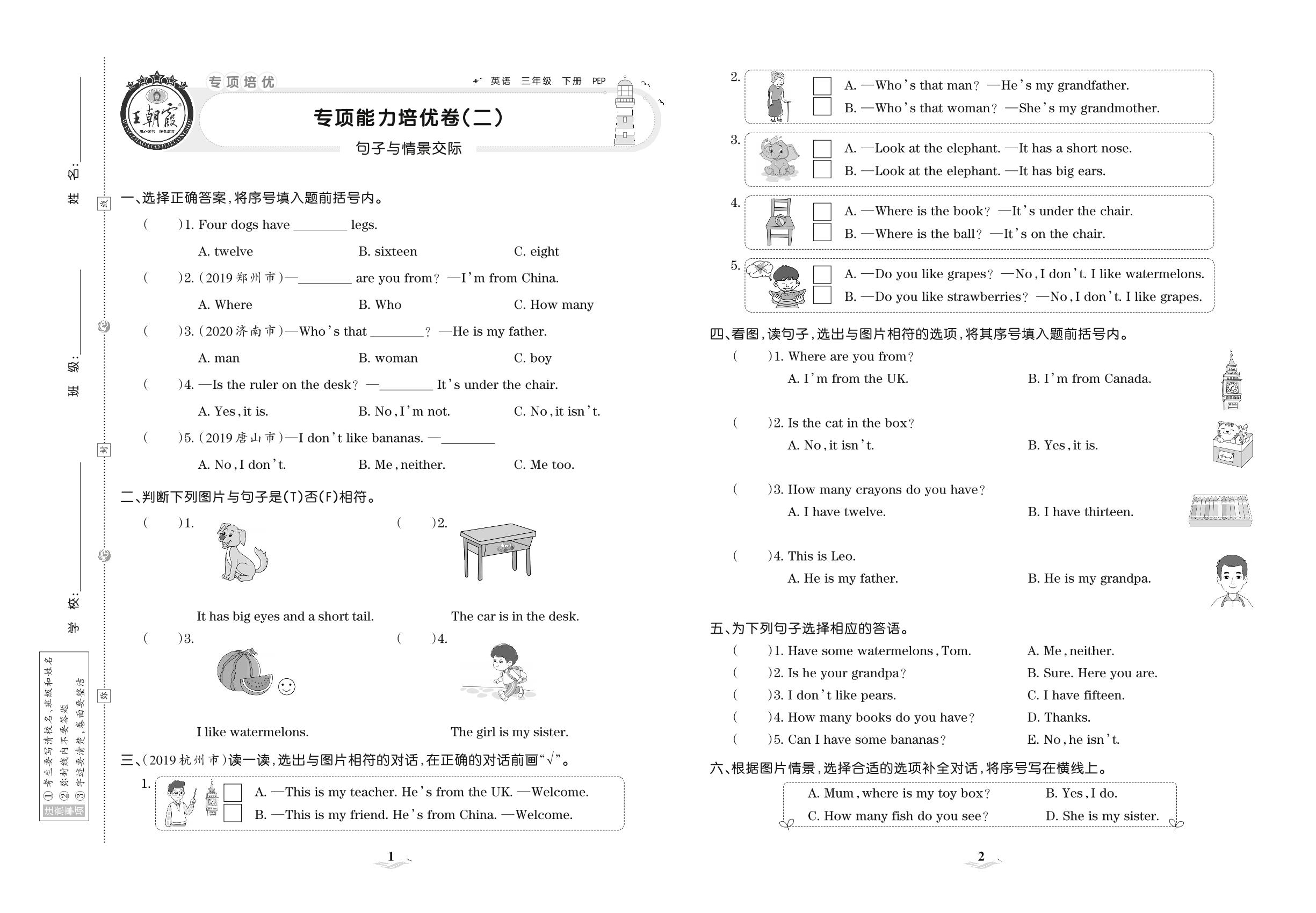 2021下册三年级英语PEP版 专项能力培优卷(二) 句子与情景交际