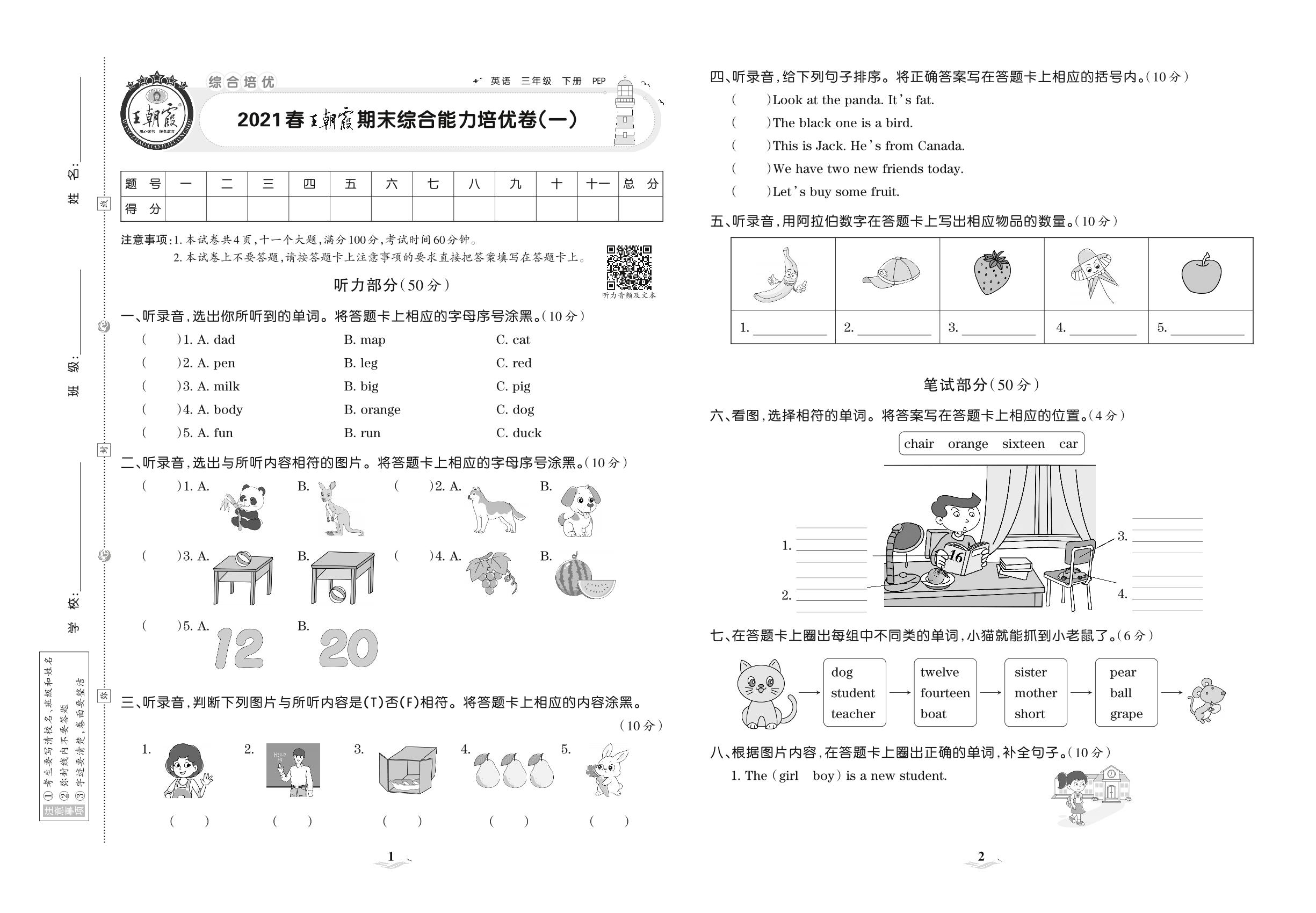 2021下册三年级英语PEP版 王朝霞期末综合能力培优卷(一)