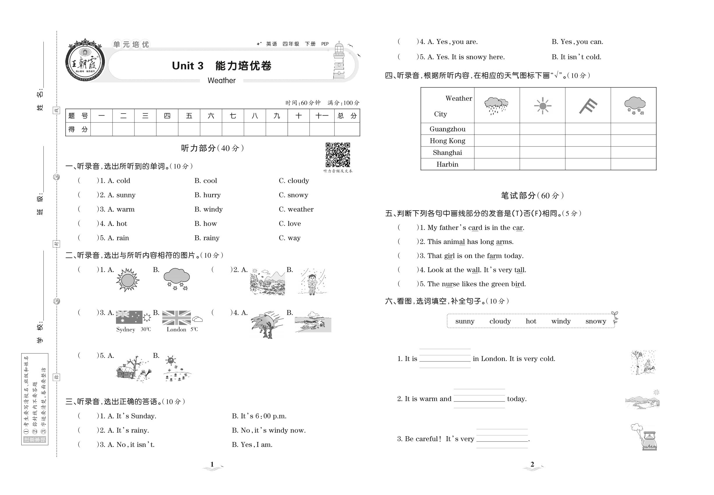 四年级英语人教PEP版(三起始)下册单元卷