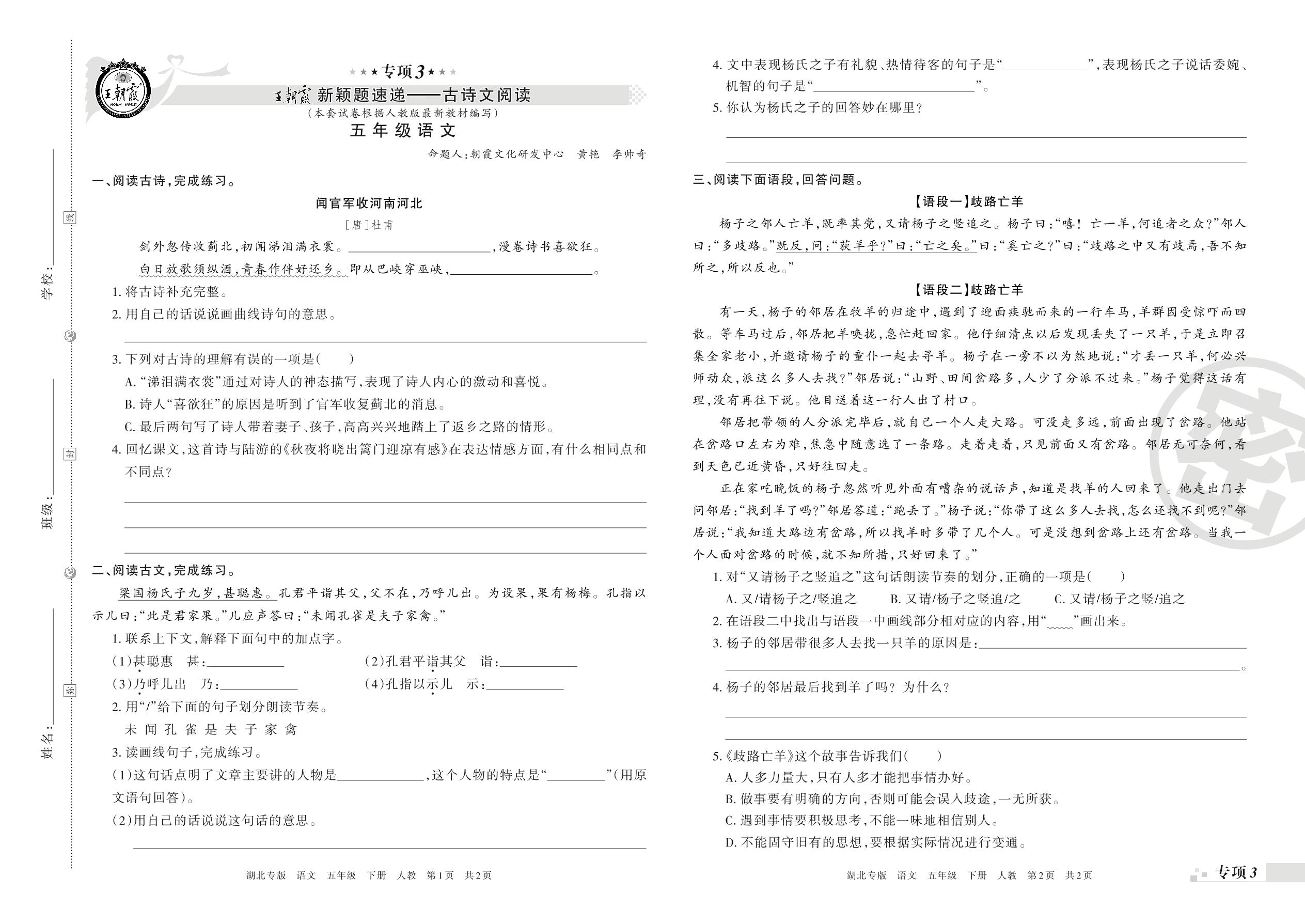 王朝霞期末专项卷——古诗文阅读、阅读理解真题归类复习五年级下册语文(人教版)_R210801183346【0】