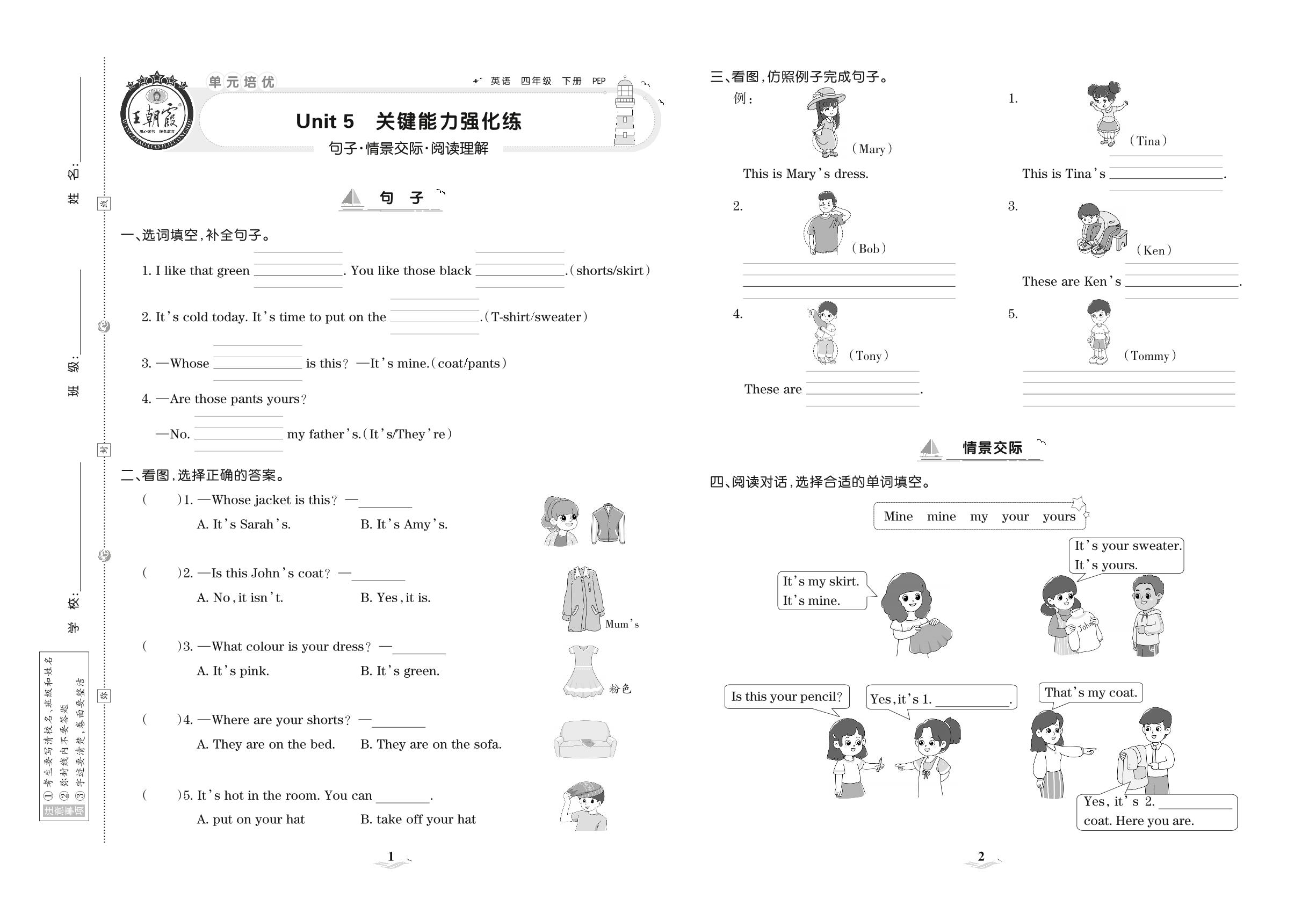 2021下册四年级英语PEP版 Unit 5 关键能力强化练