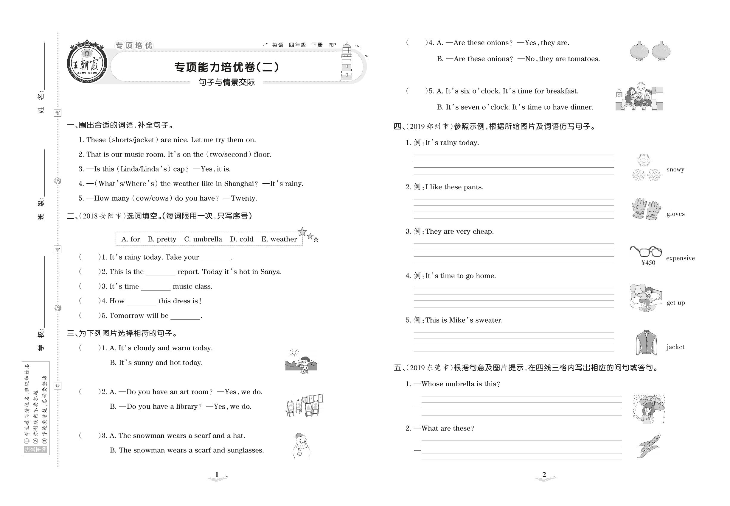 2021下册四年级英语PEP版 专项能力培优卷(二) 句子与情景交际