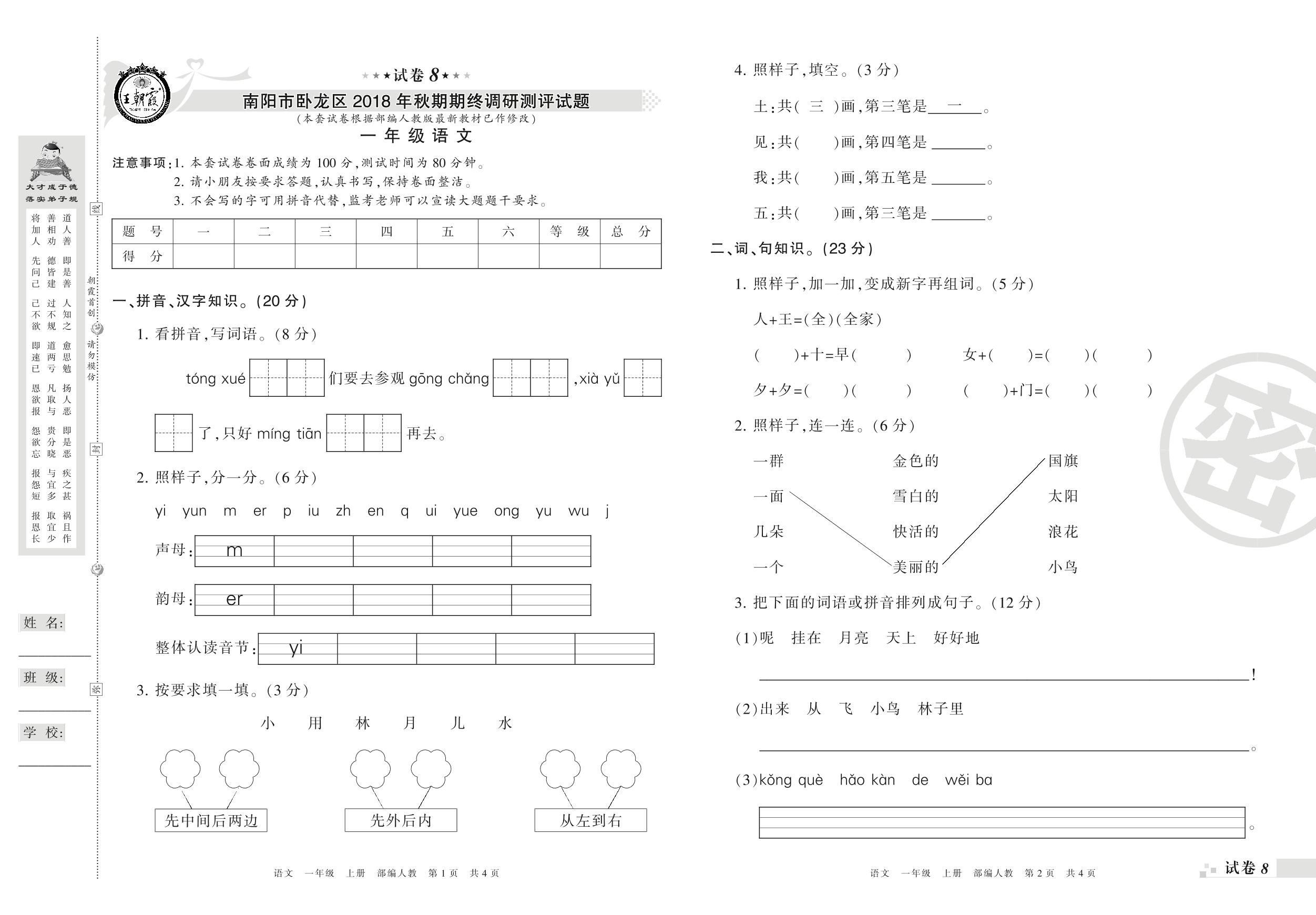 2018-2019学年第一学期南阳市卧龙区一年级语文试卷(人教版)【8】
