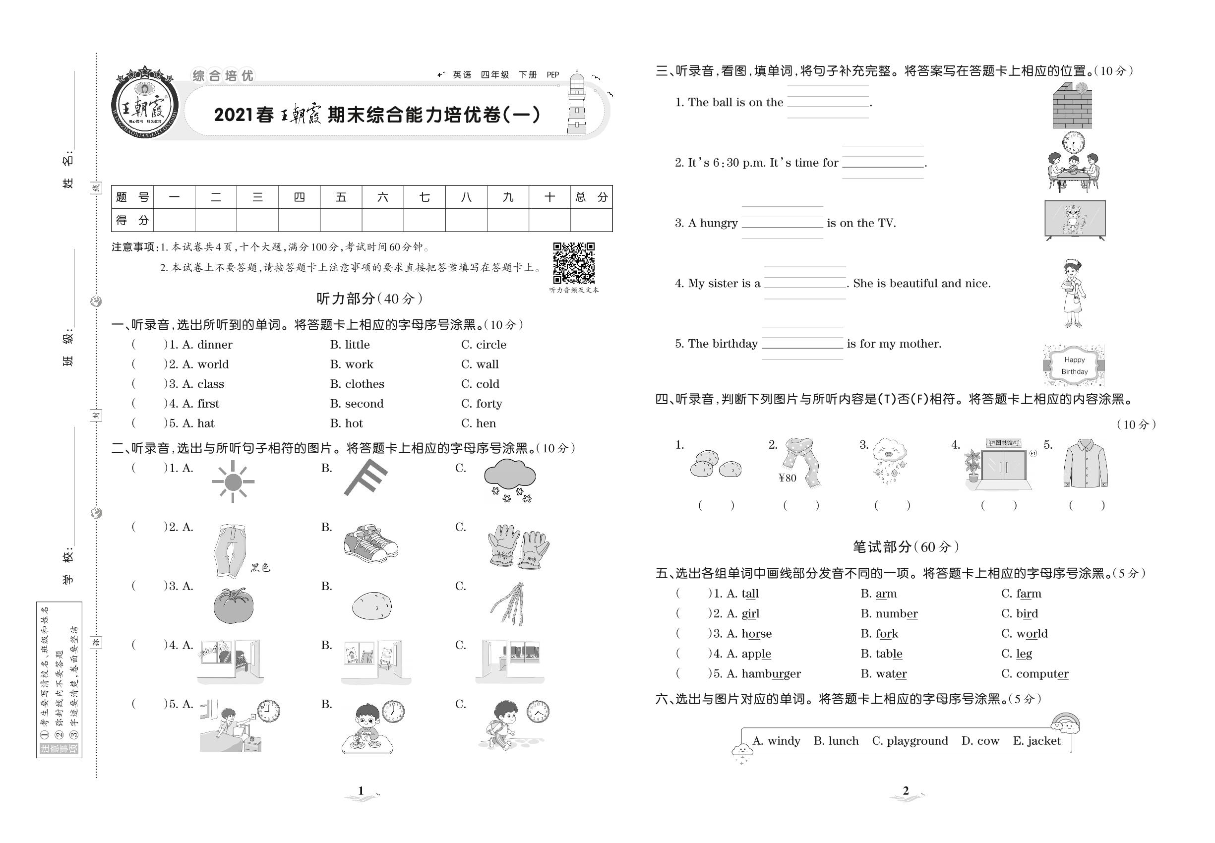 2021下册四年级英语PEP版 王朝霞期末综合能力培优卷(一)