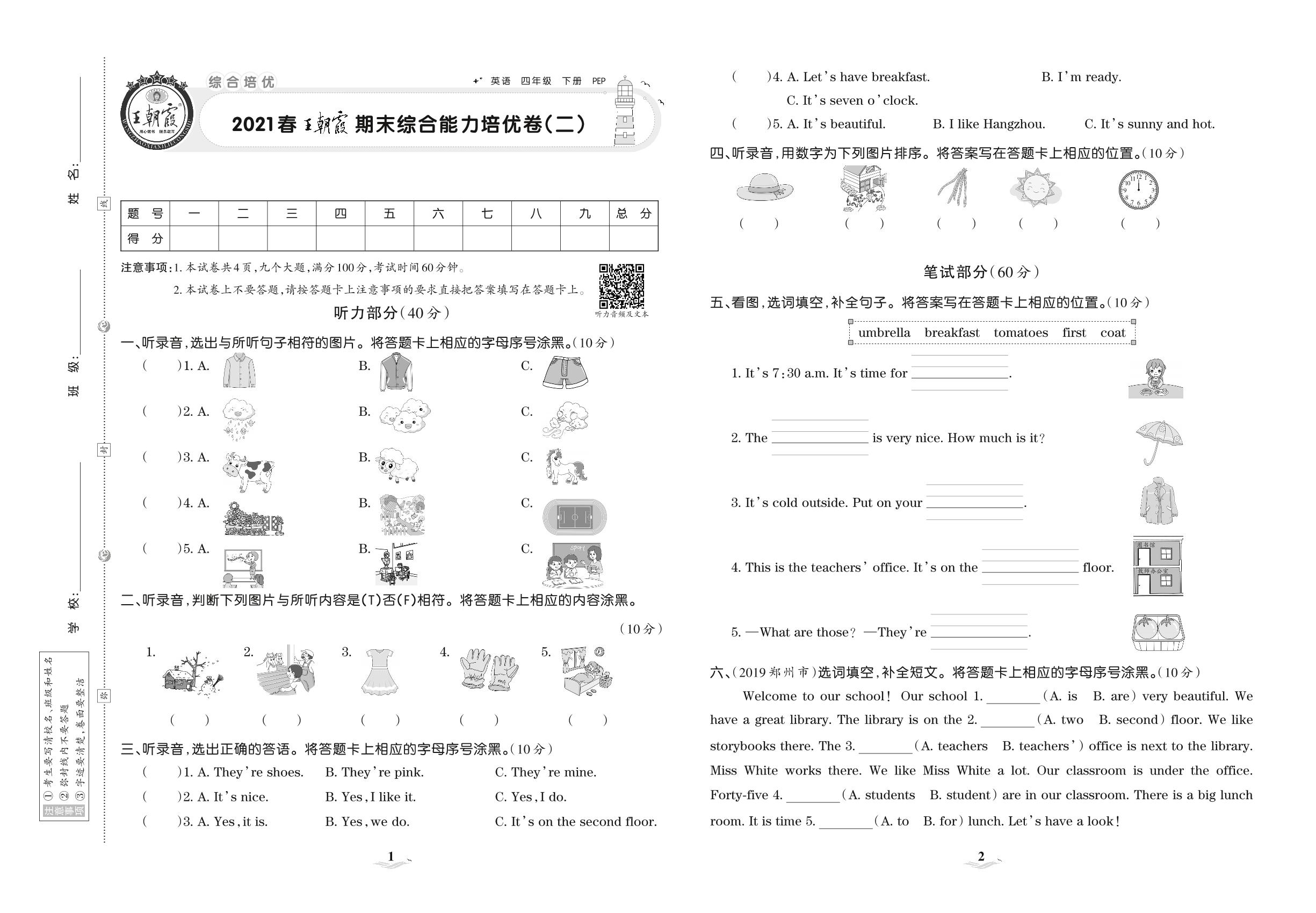 2021下册四年级英语PEP版 王朝霞期末综合能力培优卷(二)