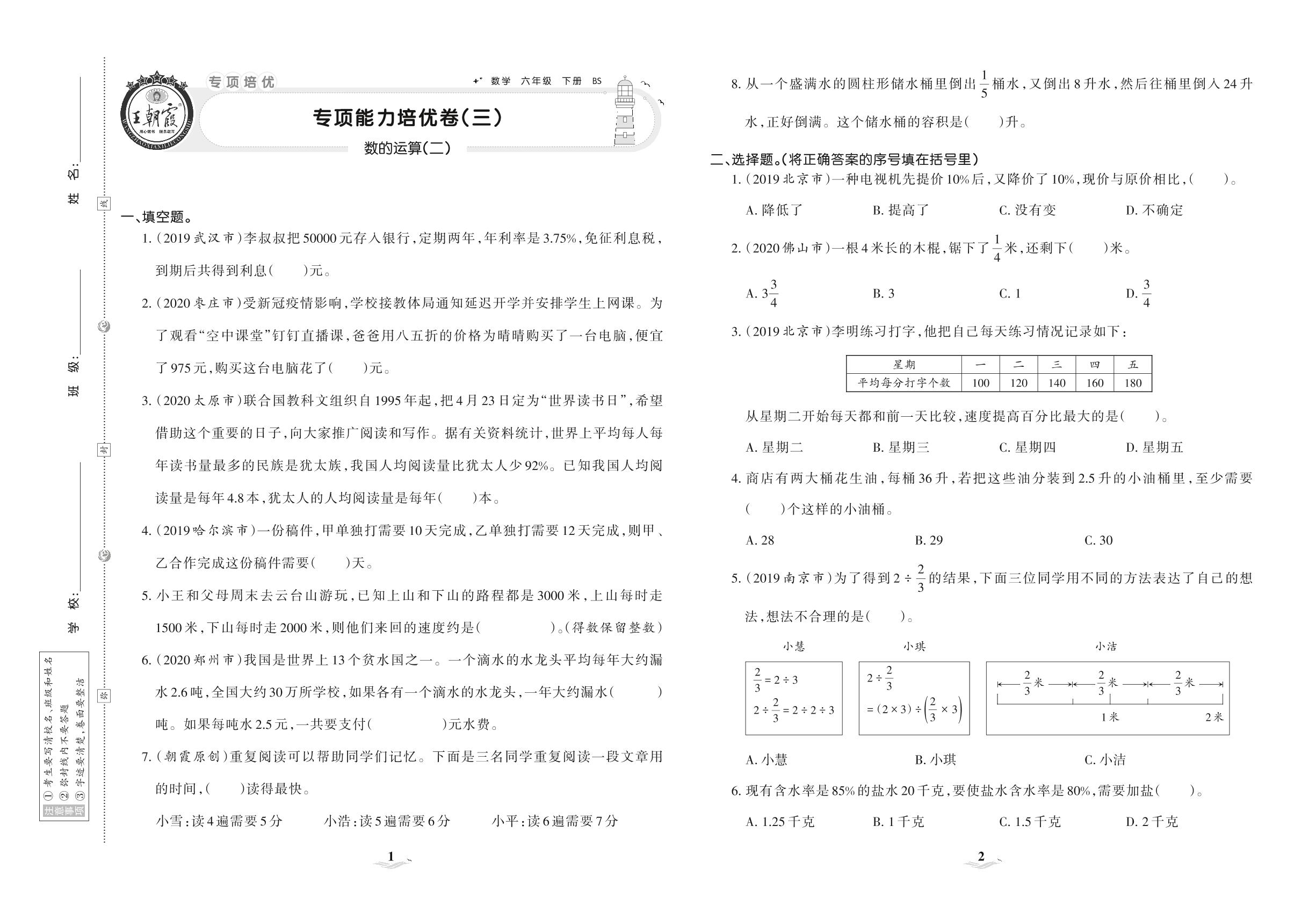2021下册六年级数学北师版 专项能力培优卷(三) 数的运算(二)