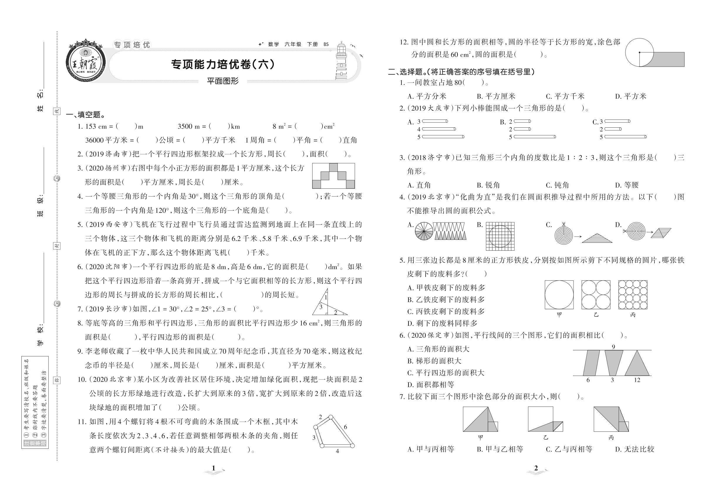 2021下册六年级数学北师版 专项能力培优卷(六) 平面图形