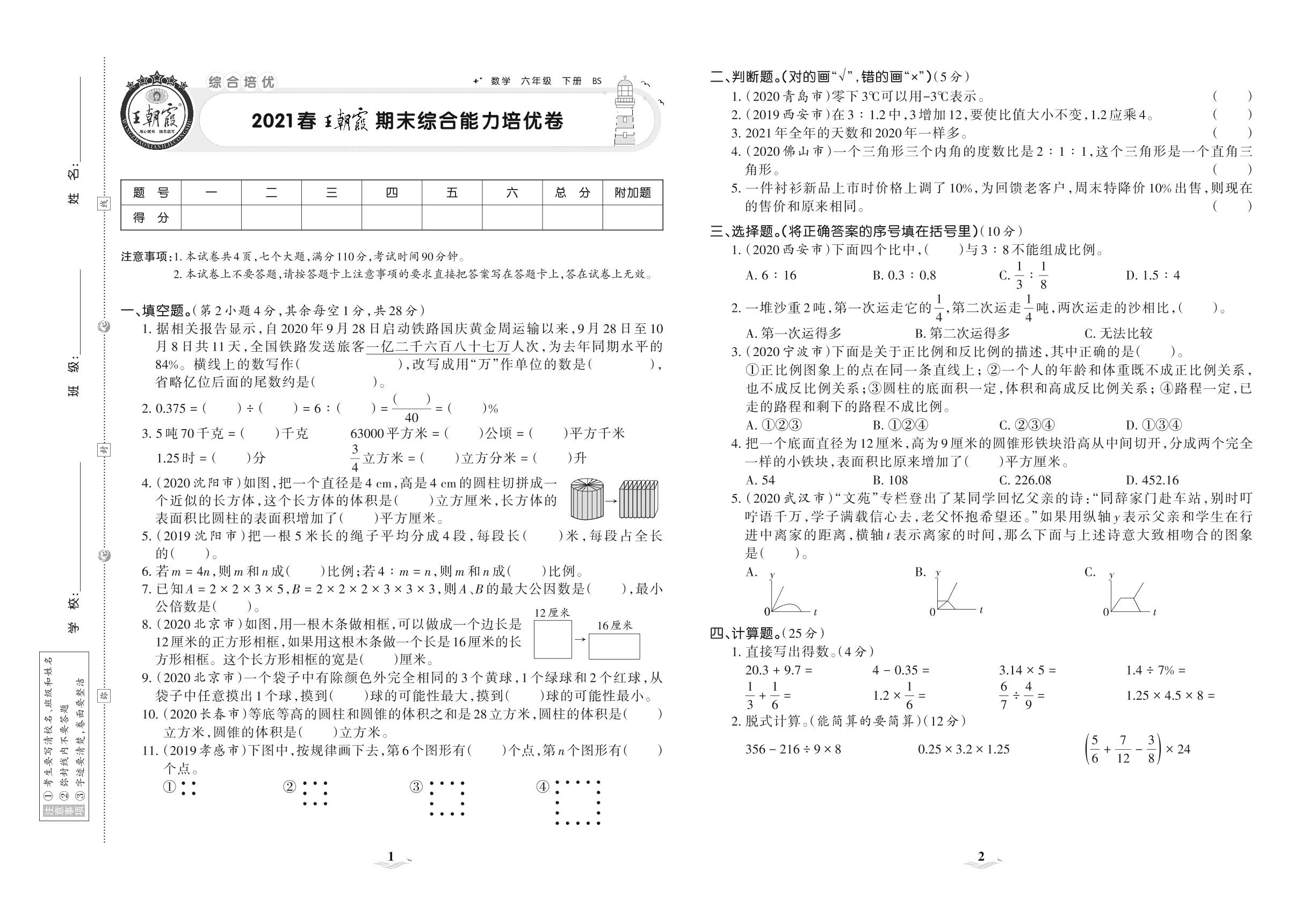 2021下册六年级数学北师版 王朝霞期末综合能力培优卷