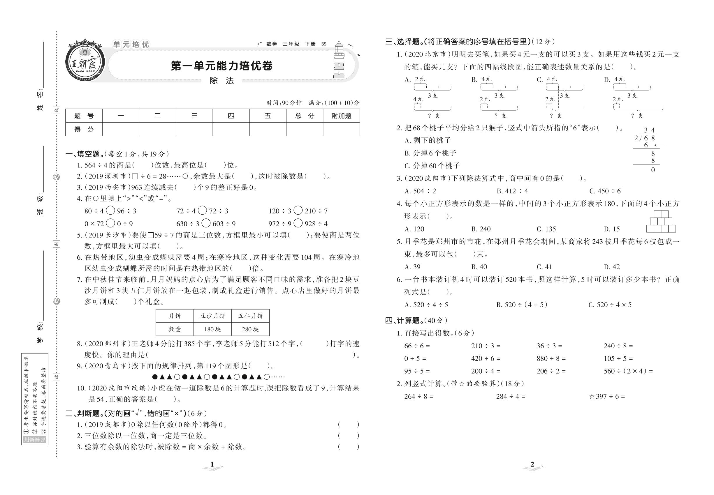 2021下册三年级数学北师版 第一单元 能力培优卷