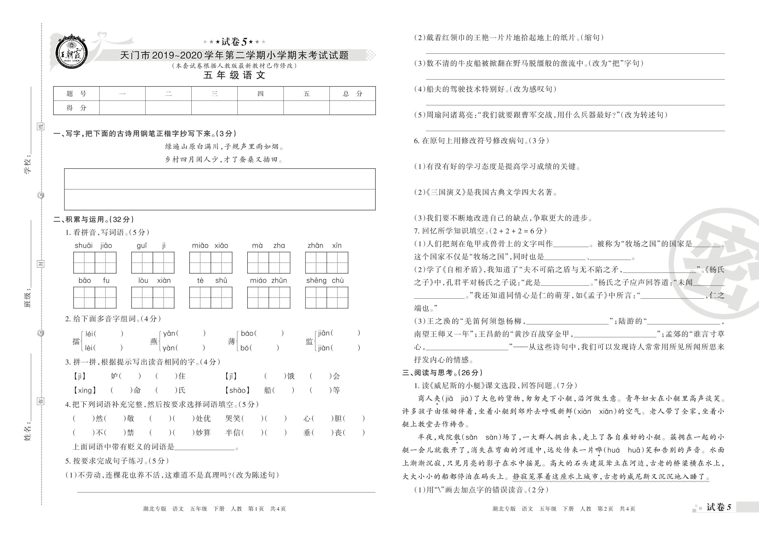 2019-2020学年第二学期天门市五年级语文试卷(人教版)【5】