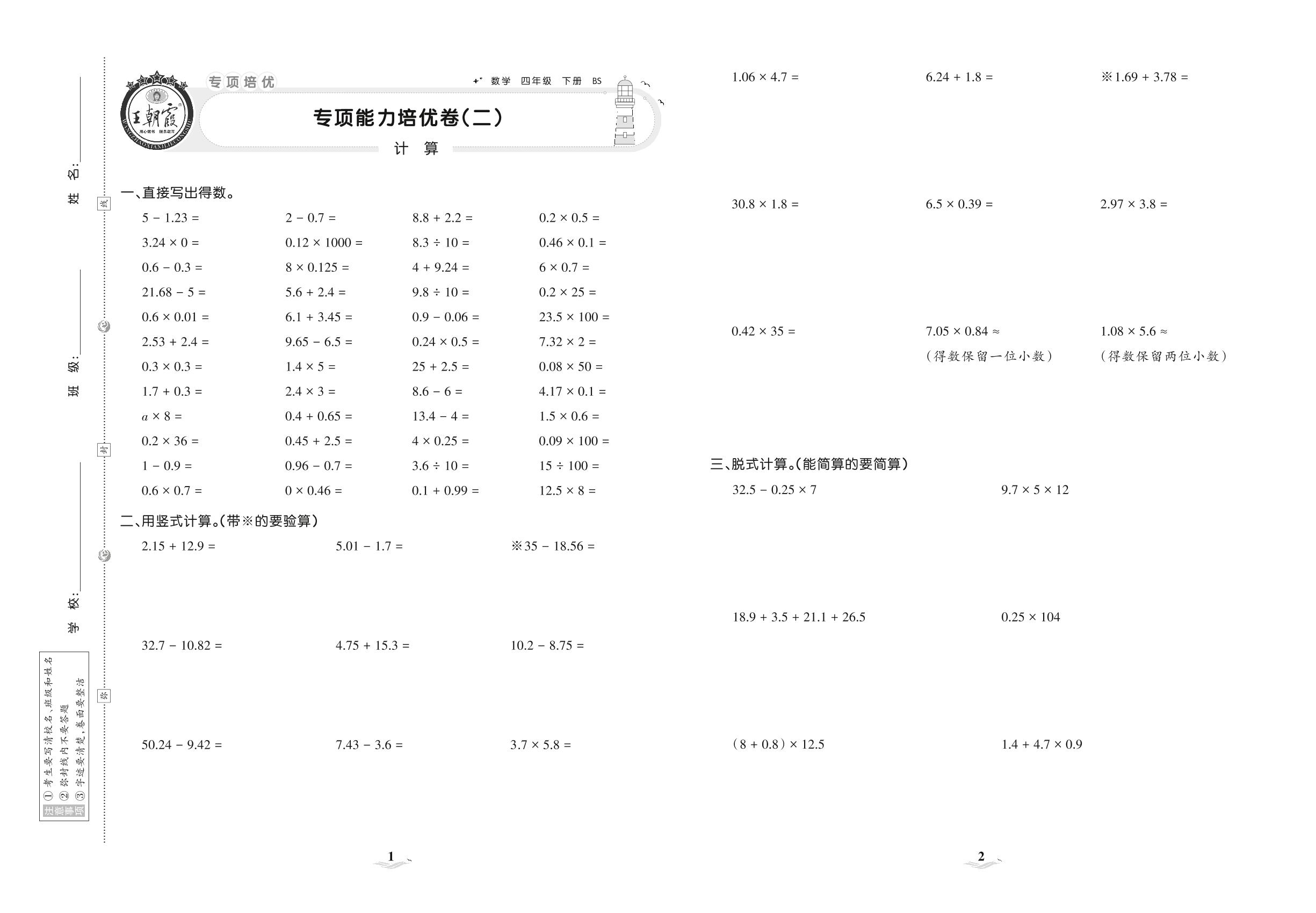 2021下册四年级数学北师版 专项能力培优卷(二) 计算