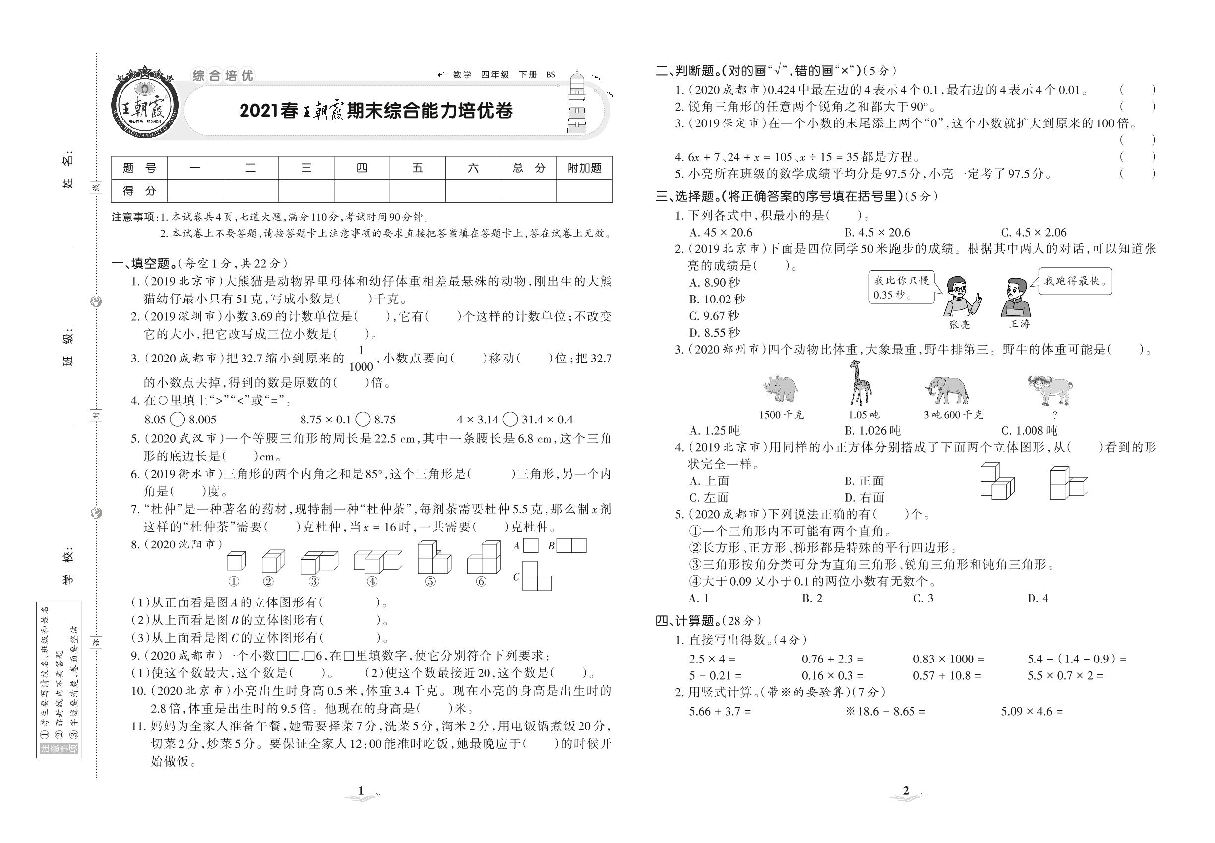 2021下册四年级数学北师版 王朝霞期末综合能力培优卷