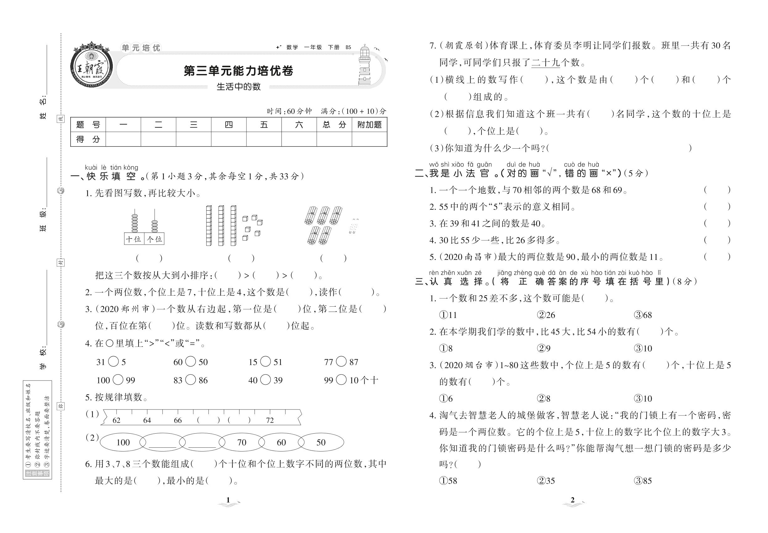 2021下册一年级数学北师版 第三单元 能力培优卷