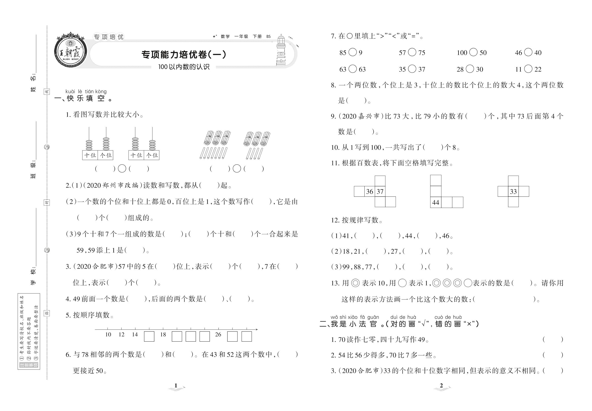 2021下册一年级数学北师版 专项能力培优卷(一) 100以内数的认识