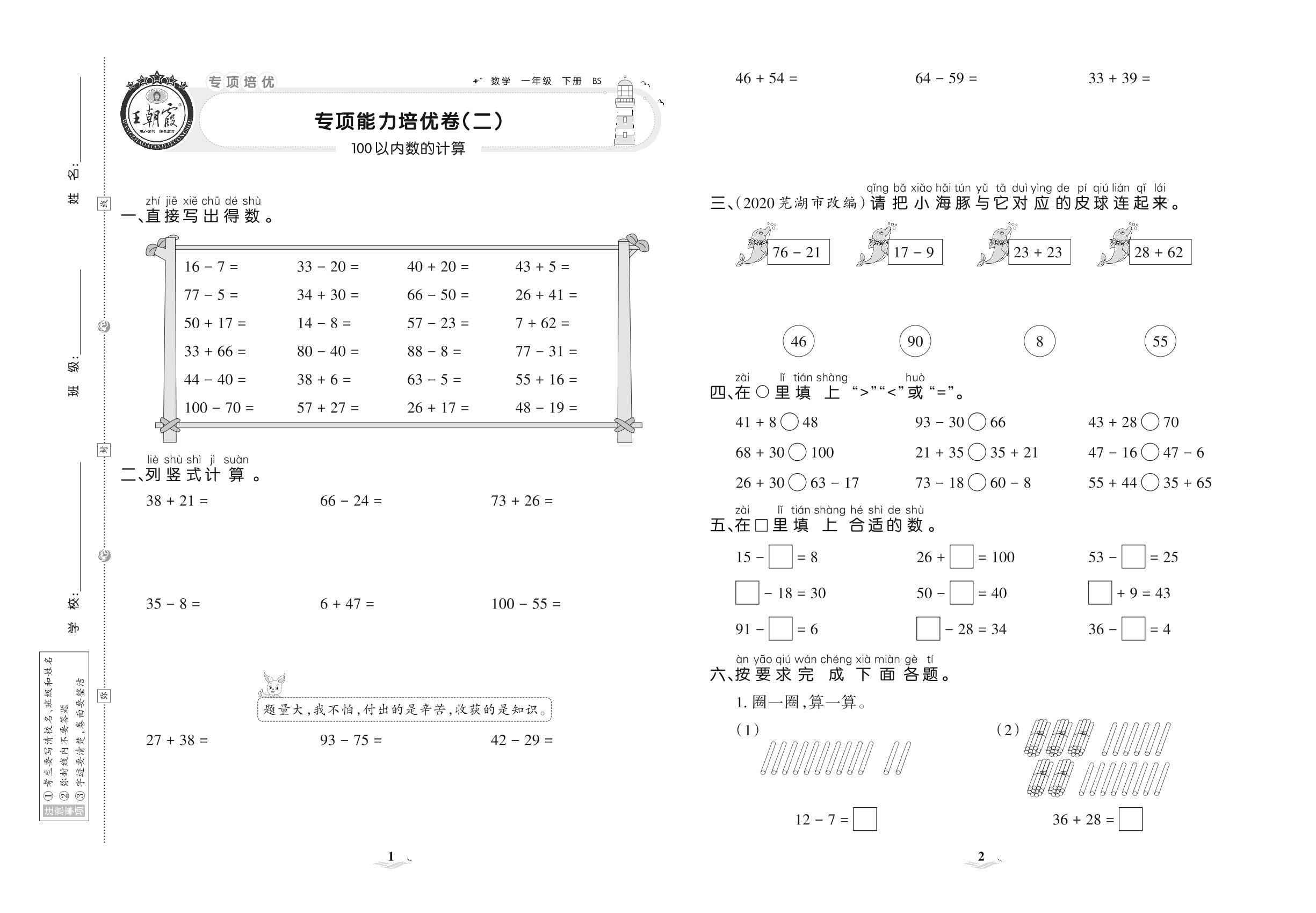 2021下册一年级数学北师版 专项能力培优卷(二) 100以内数的计算