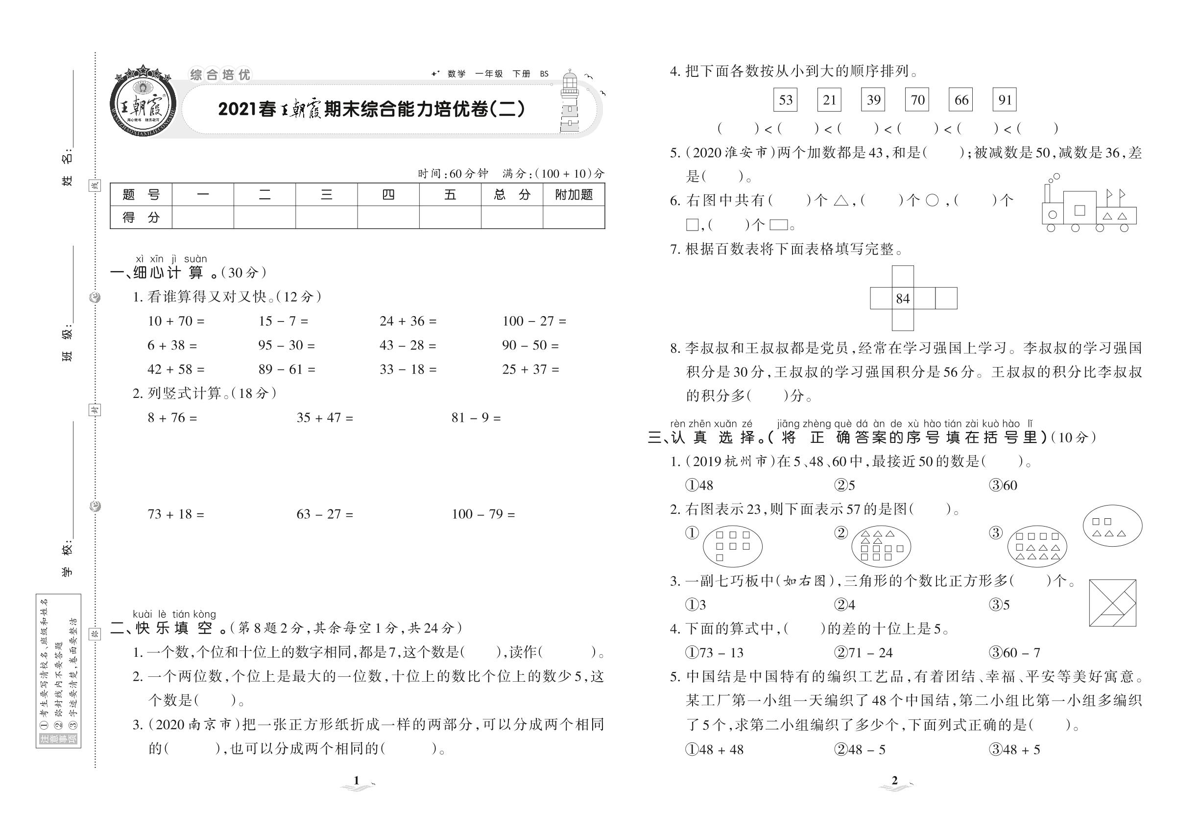 2021下册一年级数学北师版 王朝霞期末综合能力培优卷(二)