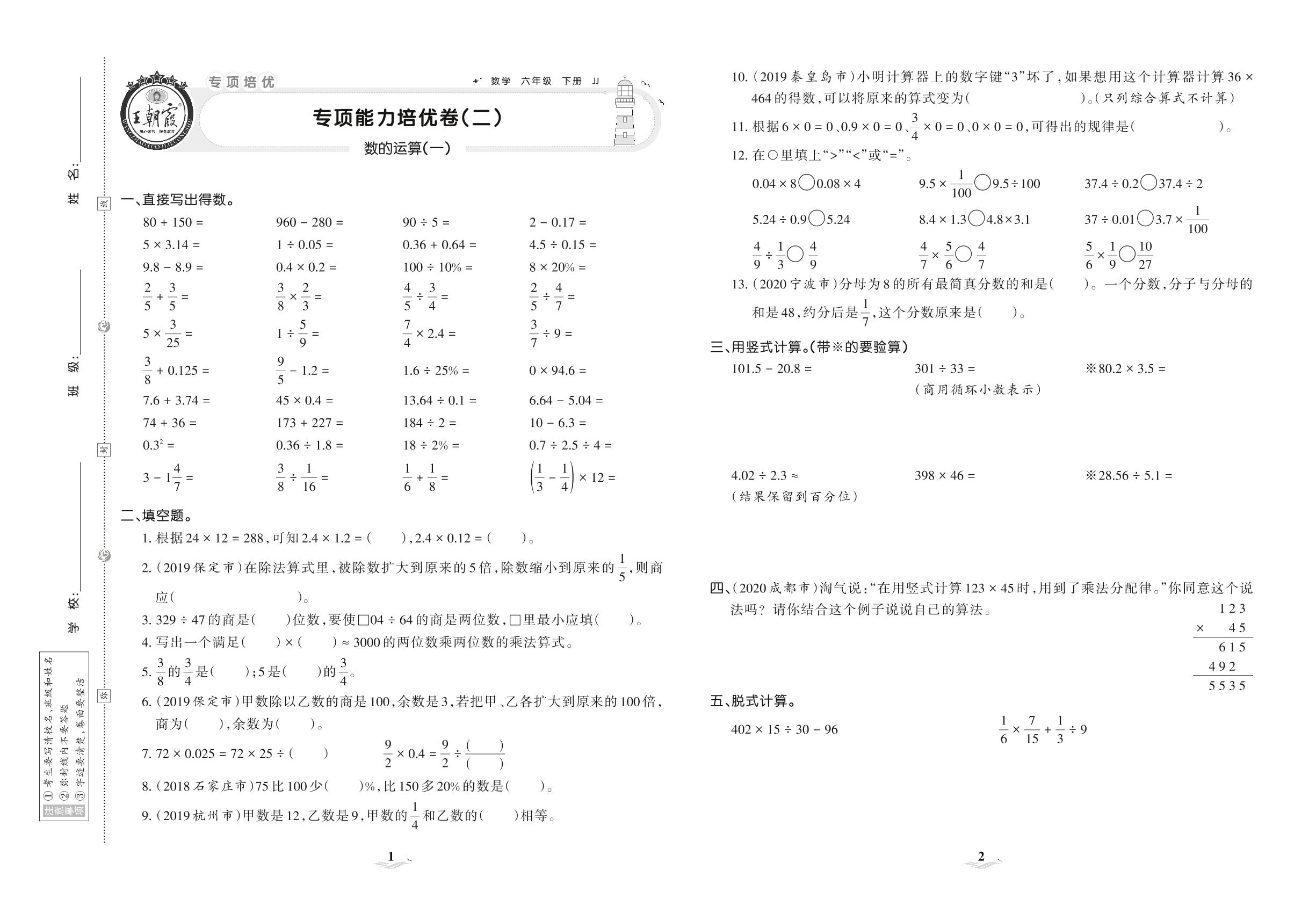 2021下册六年级数学冀教版 专项能力培优卷(二) 数的运算(一)