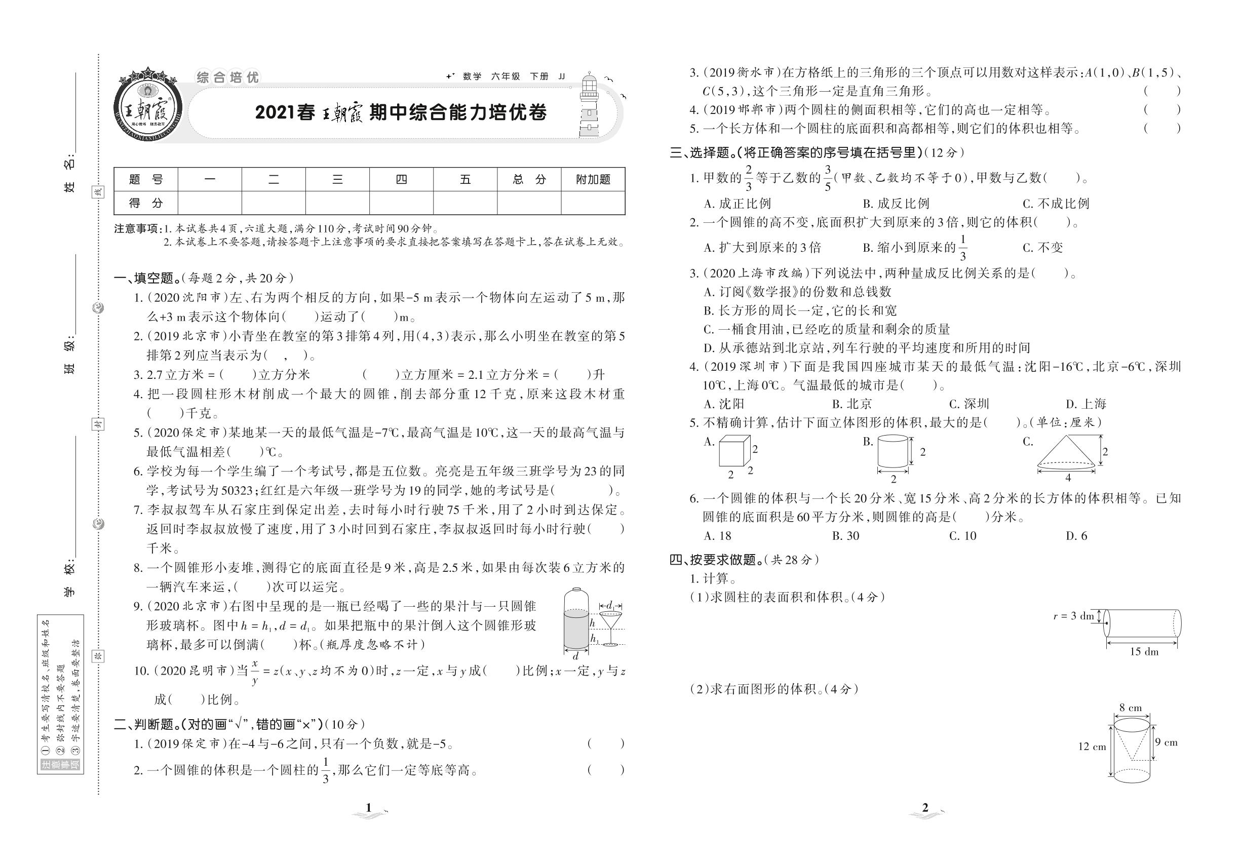2021下册六年级数学冀教版 王朝霞期中综合能力培优卷