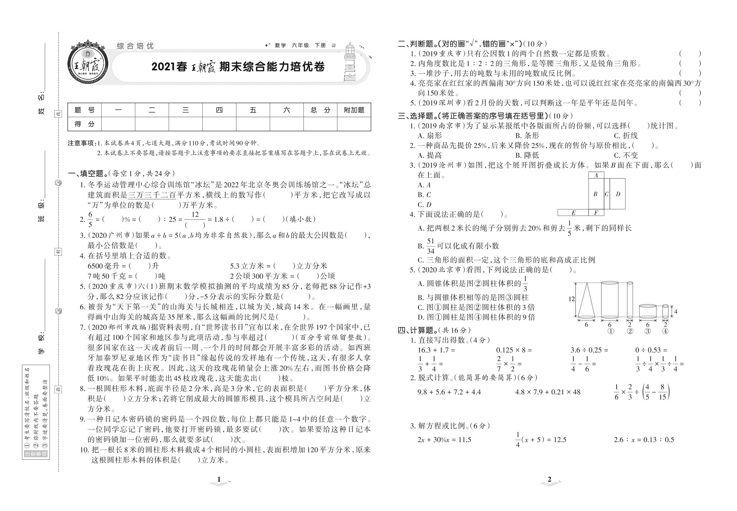 2021下册六年级数学冀教版 王朝霞期末综合能力培优卷