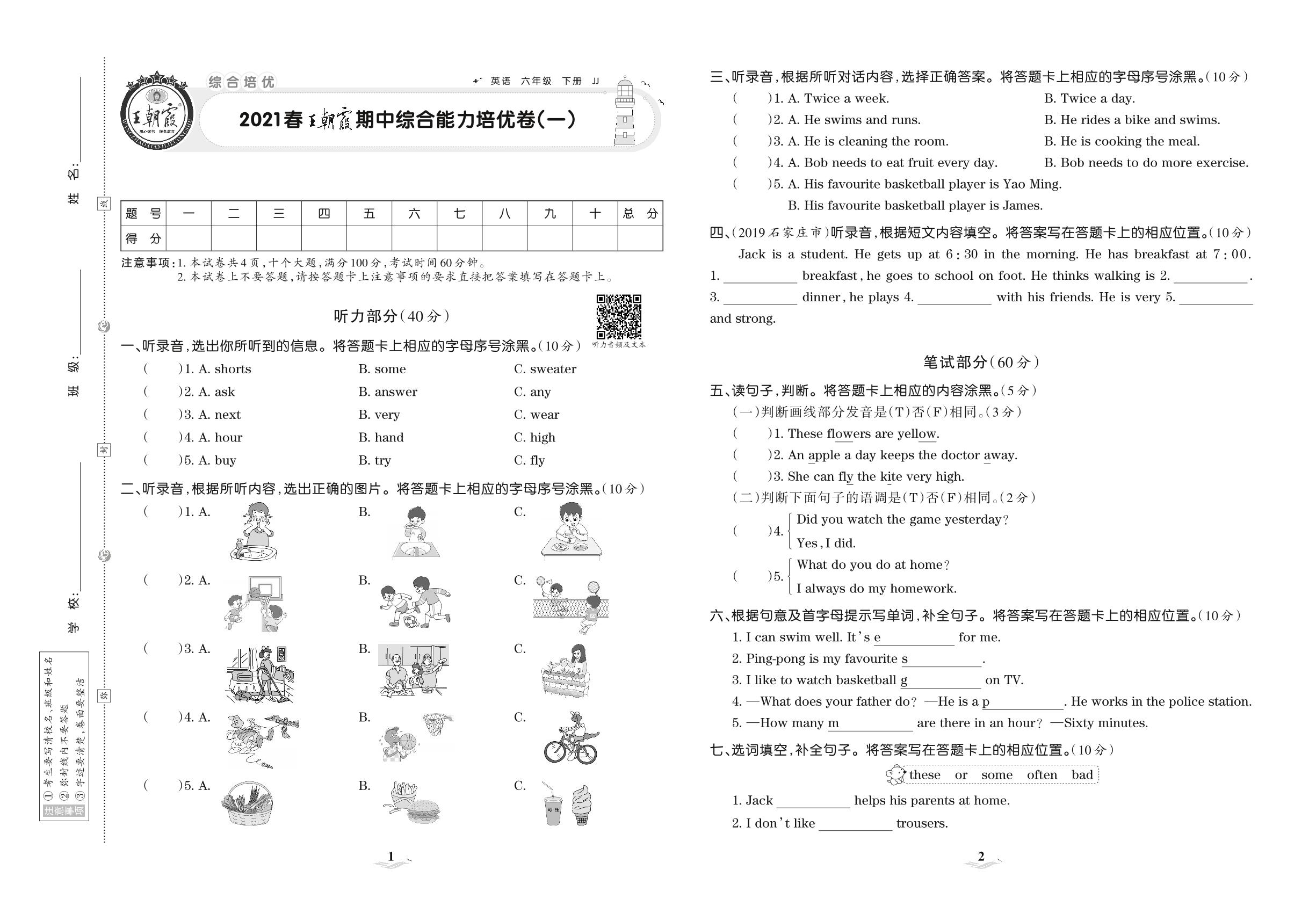 2021下册六年级英语冀教版 王朝霞期中综合能力培优卷(一)